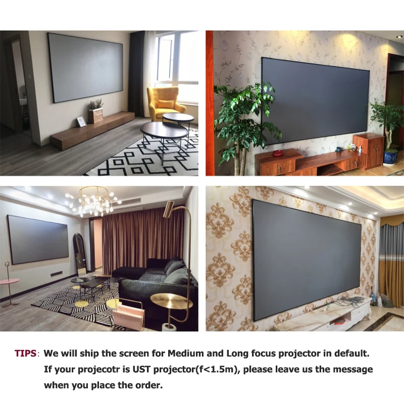 TIPS1: Этот экран ALR подходит для коротких прожекторов (фокусное расстояние более1,5 м), Проектор средней и длинной фокусировки. Если ваш проектор (ультра) коротковолновый (фокусное расстояние меньше1,5 м), Пожалуйста, оставьте нам сообщение, мы сделаем для вас специальный материал поверхности.