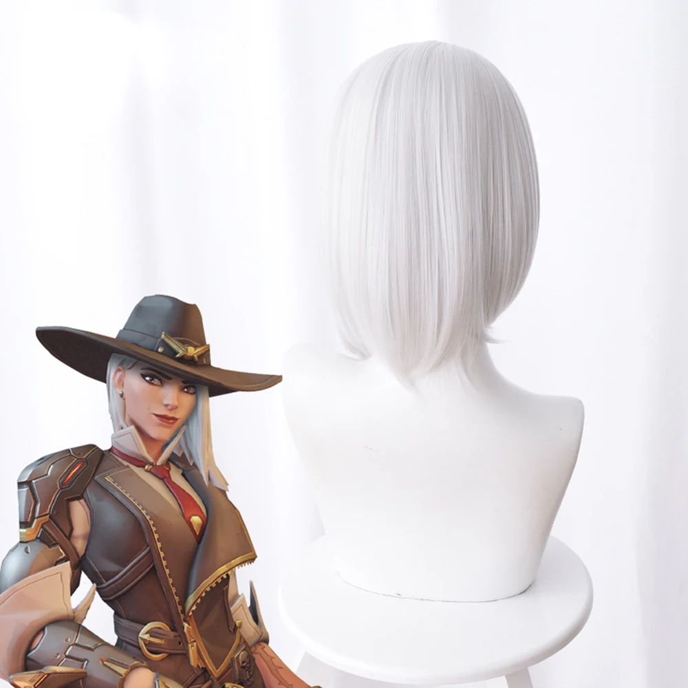 Парик Overwatch Эш Косплей 30 см, короткие прямые термостойкие синтетические волосы, парик для костювечерние, вечерний, серебристо-белый