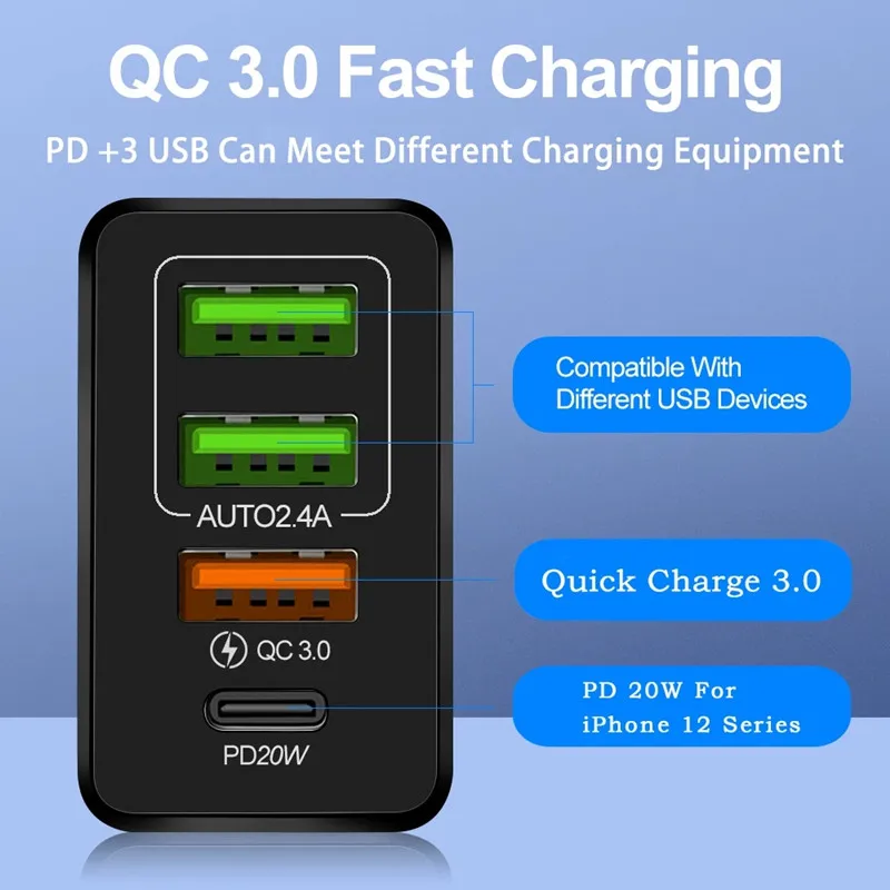 Сетевое зарядное устройство с 4 USB-портами и поддержкой быстрой зарядки, 36 Вт