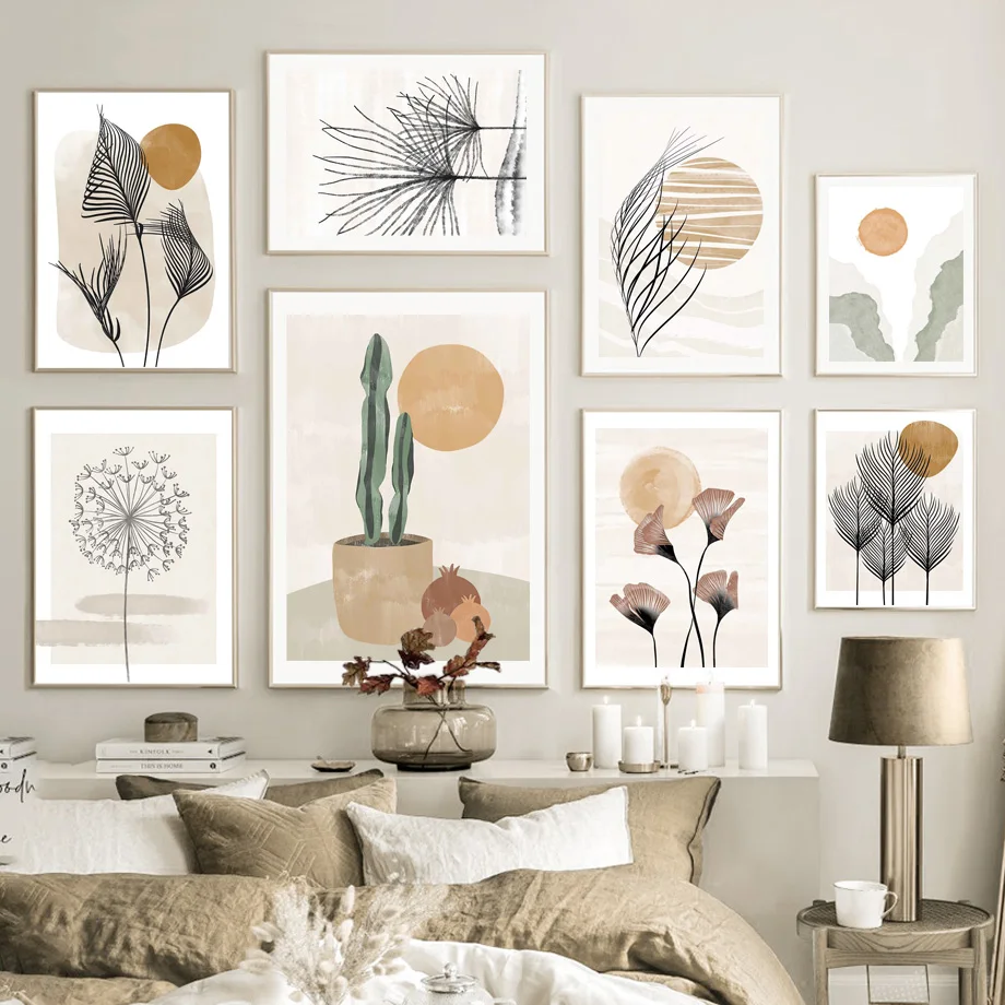 Настенная картина в стиле бохо с натуральными листьями, кактусами, одуванчиками, Абстрактная Картина на холсте, скандинавские постеры и принты, настенные картины, декор для гостиной