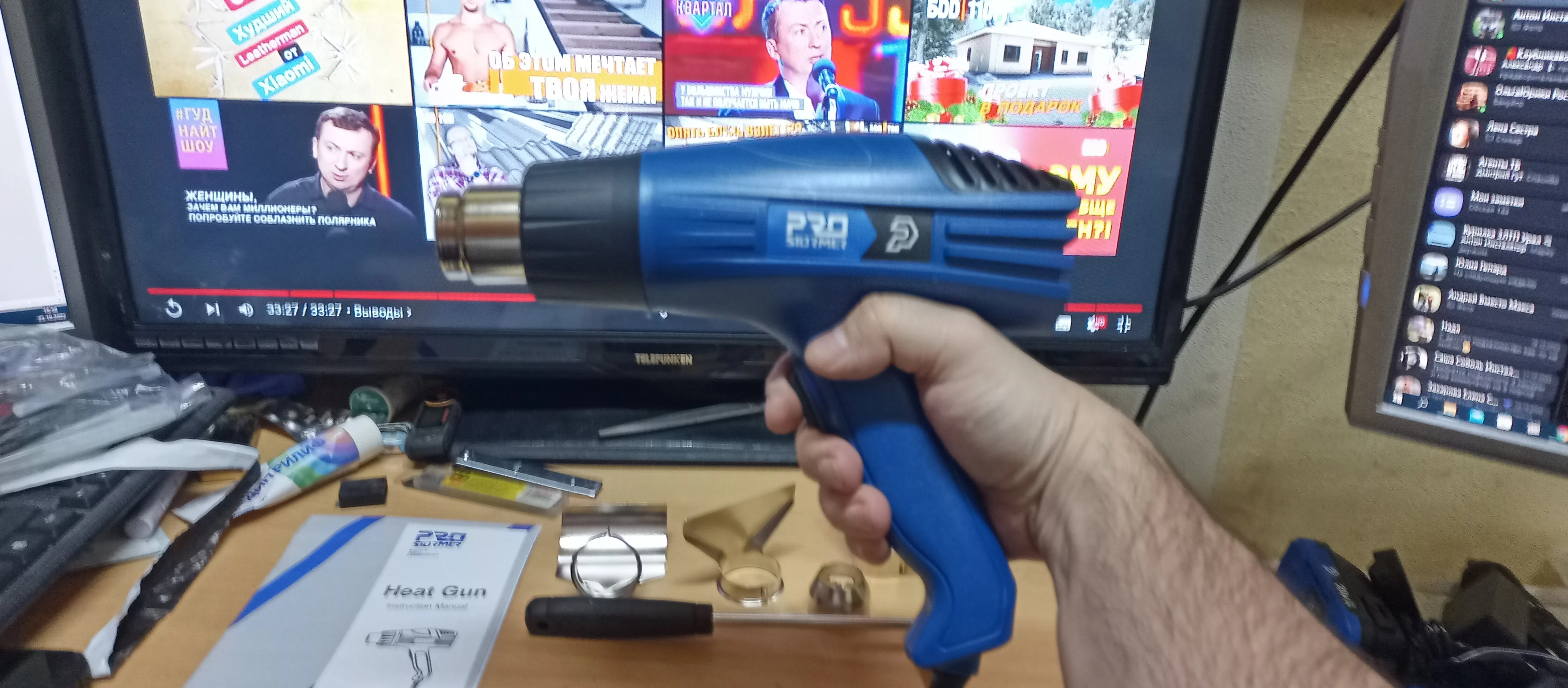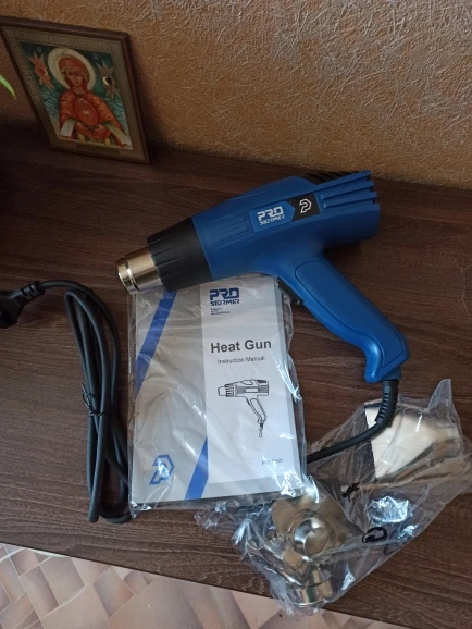 Доставка из России в Салехард, 5Post, меньше двух недель. Брал базовый комплект без сумки (пожалел, сумки отличные - брал к другому инструменту). октябрь 2022 за 1200 руб. Приятный пластик без видимых проблем. В руке лежит очень уверенно. Переключатель на две температуры 400 и 600 градусов. Стандартный набор сопел. Провод 3х1 мм2, "деревянный". За это цену отлично. Отзыв дополню когда попробую в деле.