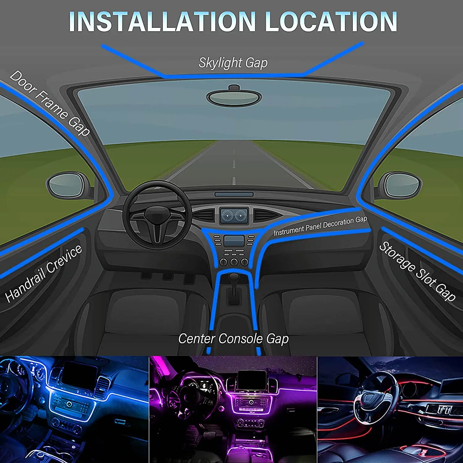 【Управление через приложение и 16 миллионов цветов 】 светильник для отделки салона автомобиля использует беспроводное приложение для управления, подходящее для IOS или Andriod. Встроенный 29 предустановленных режимов, управление приложением для включения или выключения света, тусклый или яркий и даже регулировка скорости режима, Персонализация внутреннего пространства автомобиля.