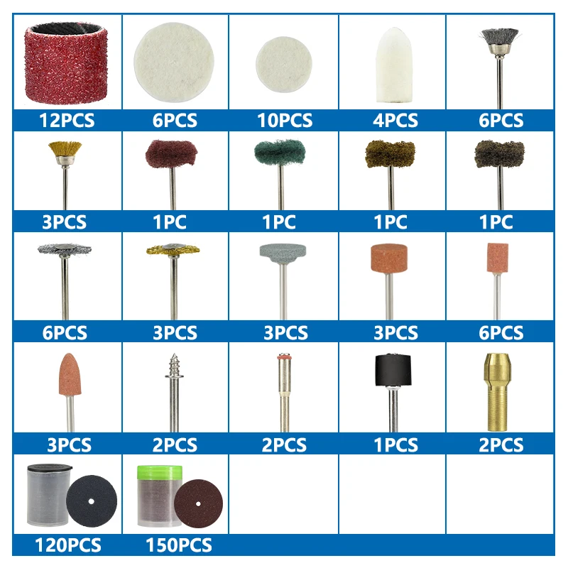 5. Эти электрические наборы для полировки имеют шлифовальную пасту, шлифовальный камень, наждачную бумагу, шлифовальный круг, полировальную пасту, нейлоновую щетку, стальную проволочную щетку, сверлильные Шатуны и т. д.