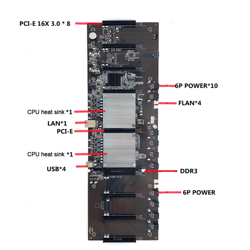 X79 чип и одноканальный LGA 2011 ЦП разъем.Интерфейс видеокарты 8 PCIe 3,0 16X.Поддержка 3060 графических карт.65 мм Слот для видеокарты с большим расстоянием.Мощность обработки одного графического процессора составляет до 48MH/s, и он идеально поддерживает графические карты с видеопамятью 4 Гб, что значительно улучшает функцию майнинга мощности обработки.