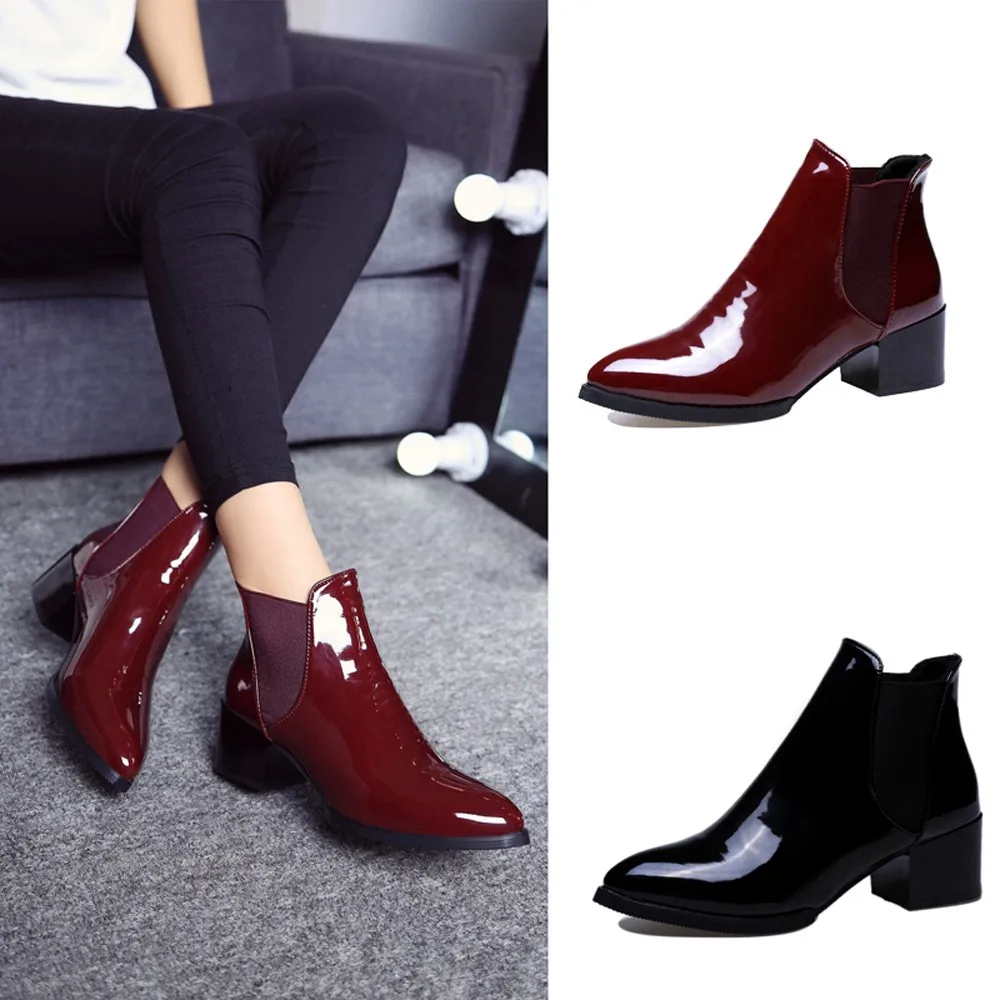 Новое поступление 2022, модная обувь, женские ботинки, эластичные ботильоны из лакированной кожи, ботинки с острым носком на низком каблуке, женская сексуальная обувь
