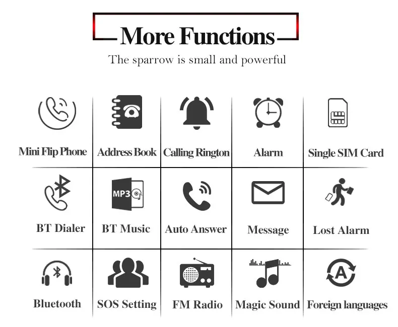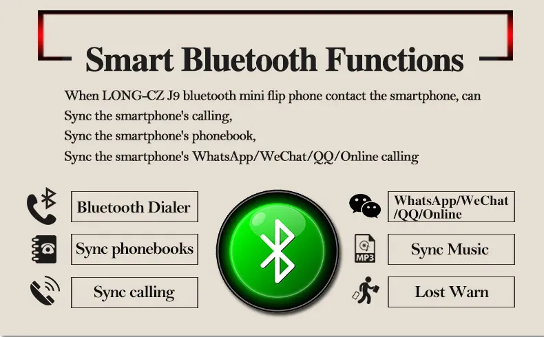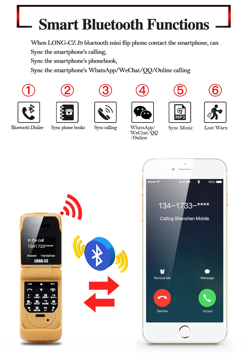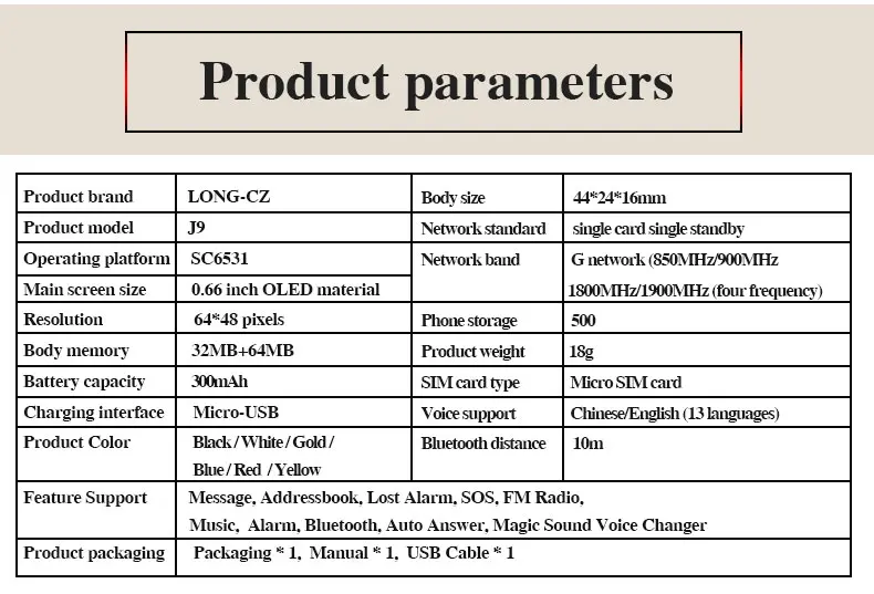 Языки:Английский, арабский, французский, Hindi, португальский, русский, испанский, тайский, вьетнамский, персидский, немецкий, голландский, итальянский Информация о продуктеВибрация: нетМодель пользователя: Мелодия звонка, тишинаSim-карта: Поддержка mirco Iphone4 sim-картаBleutooth:V3.0, BT3.0, BT Dialer; BT Music;Изменение голоса: 13 видов стилей изменение голосаНабор номера SOS: поддержка: три набора номера SOSЭкран: OLED 0,66 дюймаРазмер: длина 44 мм * ширина 24 мм * высота 16 ммОдин вес: 18,5 г Сеть2G сеть GSM850/900/1800/1900 МГцДругие функции:Синхронизация онлайн-звонков whatsapp \ wechat \ QQ \ line ect при контактах с BluetoothСинхронизация телефонной книги, синхронизация телефонной книги, магазин сообщений, FM ReadioПоддержка FM (необходимо вставить наушники с портом Micro USB)Мини флип мобильный телефон LONG-CZ J9 0,66 "маленький сотовый телефон беспроводной Bluetooth Dialer FM волшебный голос Handsfree Наушники для детейАксессуарыРуководство пользователя * 1,USB кабель * 1