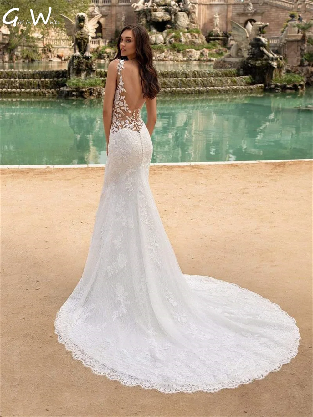 Кружевное свадебное платье с юбкой годе, открытой спиной и поясом