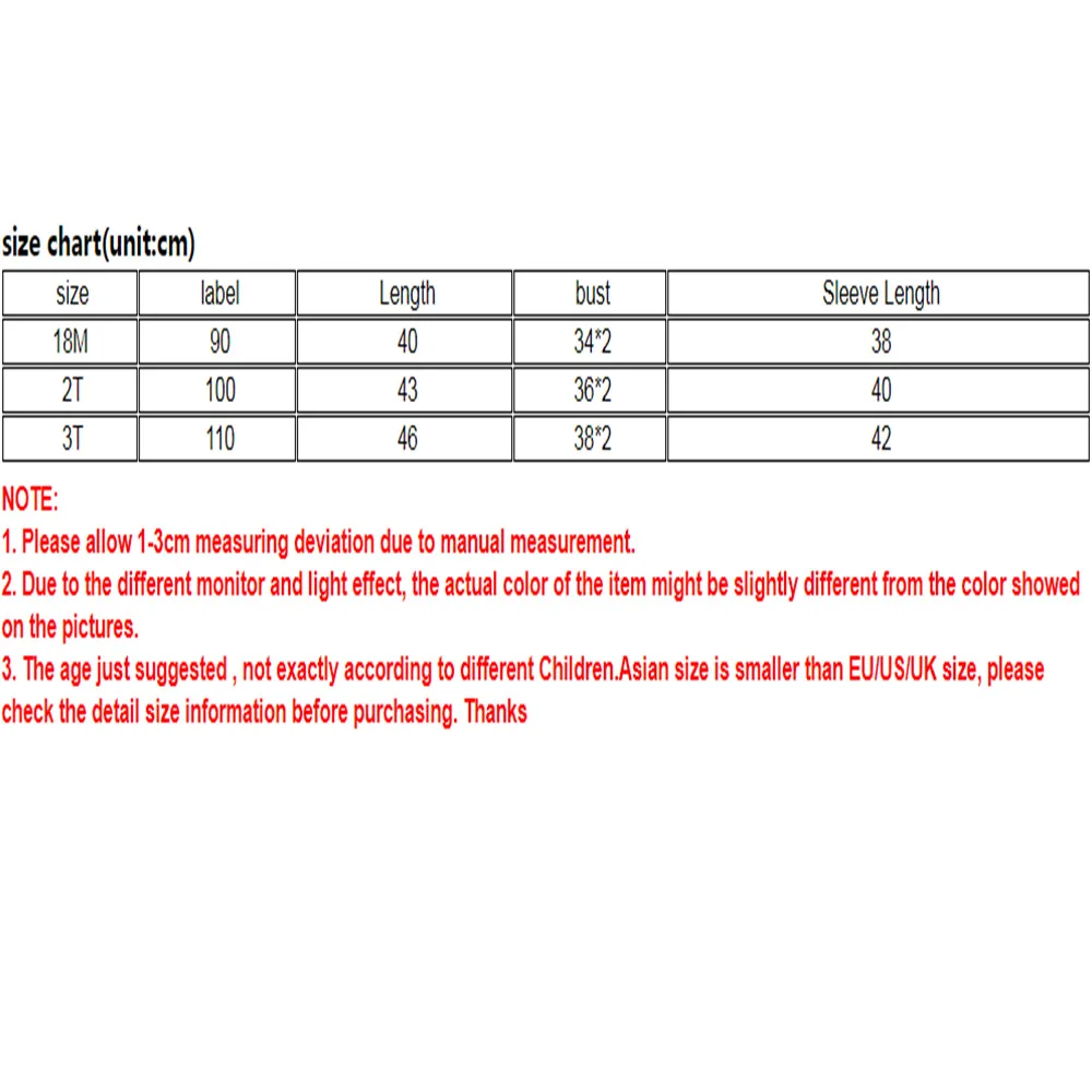 Примечание:1. Возможны отклонения в 1-3 см вследствие измерений вручную.2. Из-за различных настроек монитора и светильник эффект, фактический цвет элемента может быть s светильник ly отличается от цвета, представленного на снимках.3. Возраст только что рекомендованный, не совсем соответствует разному размеру детей. Азиатский размер меньше, чем размер ЕС/США/Великобритании, пожалуйста, проверьте подробную информацию о размере перед покупкой. Спасибо