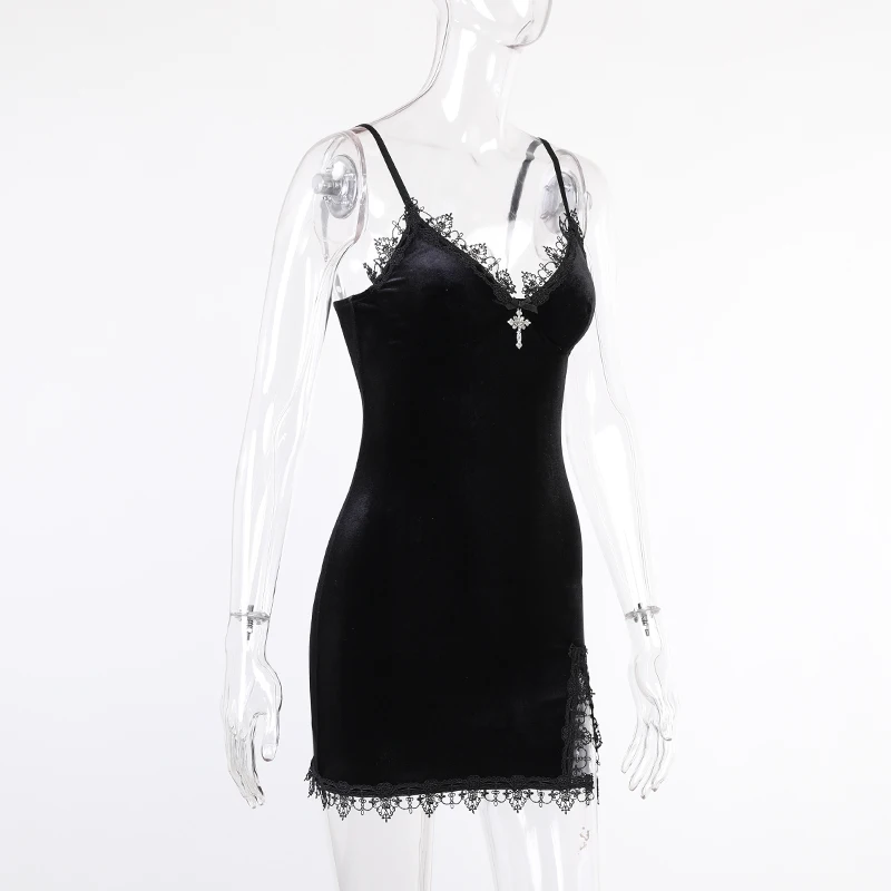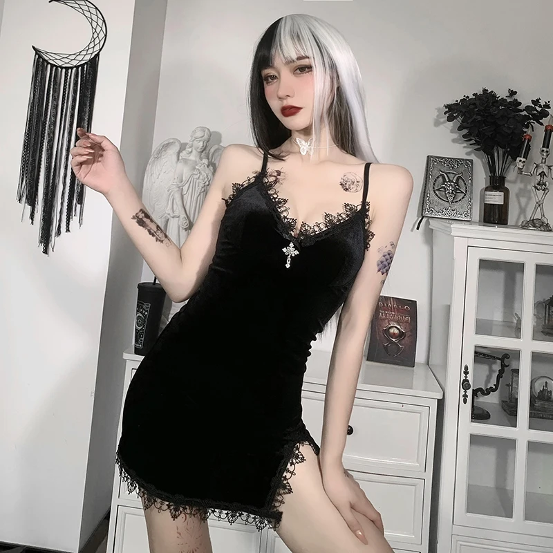 Женское винтажное платье на бретельках, готическое черное платье-мини с завышенной талией и разрезом, сексуальное платье в готическом стиле для вечевечерние НКИ, клуба, на лето