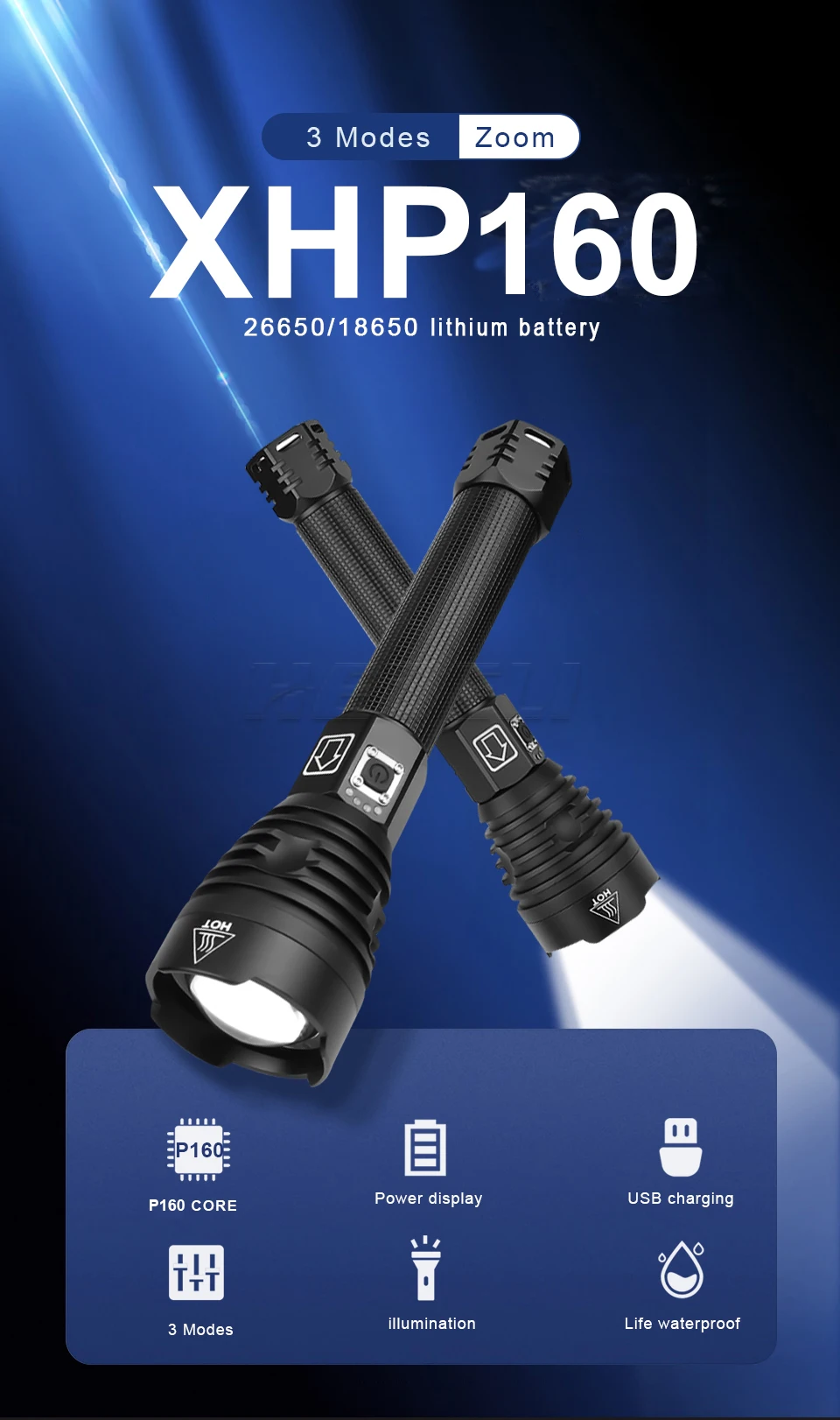 • Материал линз: выпуклая линза• Материал корпуса: алюминиевый сплав• Уровень водонепроницаемости: IPX-6• Тип батареи: 1*18650 аккумуляторная батарея или 1*26650 аккумуляторная батарея