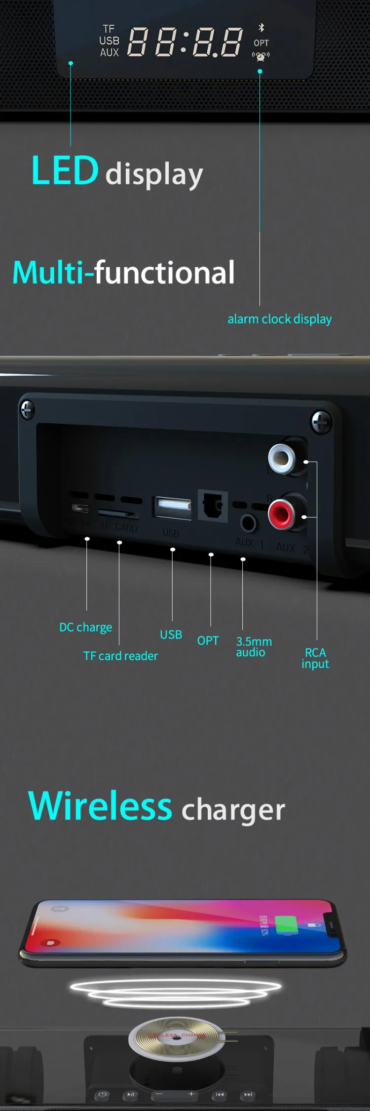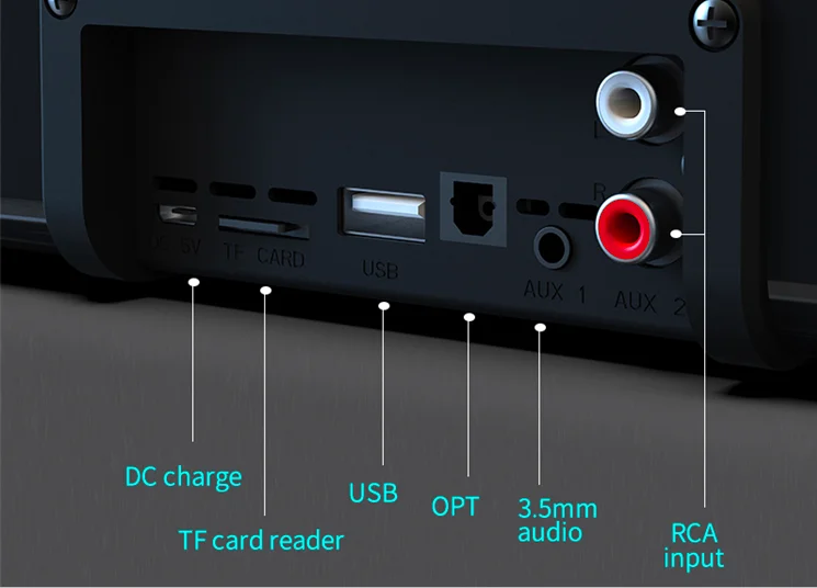 Канал: 2,01. Версия BT: V5.02. Динамик: 5 Вт * 23. Расстояние BT: 10M4. Емкость аккумулятора: 4000mA 3.7V5. Номинальное напряжение: DC 5V6. Время воспроизведения музыки: около 7 часов 7. Время работы в режиме ожидания: 120 часов 8. 1 а Время зарядки: около 5 часов 9. Аудио Вход: BT, USB, 3,5 мм Aux, TF карта, RCA,Optical10.Dimension: 248x102x57 мм/9,76 дюйма x 4,02 дюйма x 2,24 inch11.Net Вес: 680g12. Встроенный микрофон для handsfree calling13.13 Время разговора: около 6H13.QI Беспроводная зарядка: обеспечивает 3000 мАч для phone14.воспроизведение музыки + QI Беспроводная зарядка: 1500 мАч для телефона и 2 часа воспроизведения time15.аксессуары: Кабель для зарядки, 3,5 мм-RCA кабель, 3,5 мм аудио кабель, волоконно-оптический кабель, дистанционный пульт, manualSupport ТВ/ПК/телефона/планшета/ноутбука/MP3/MP4/DVD плеер/ТВ коробка