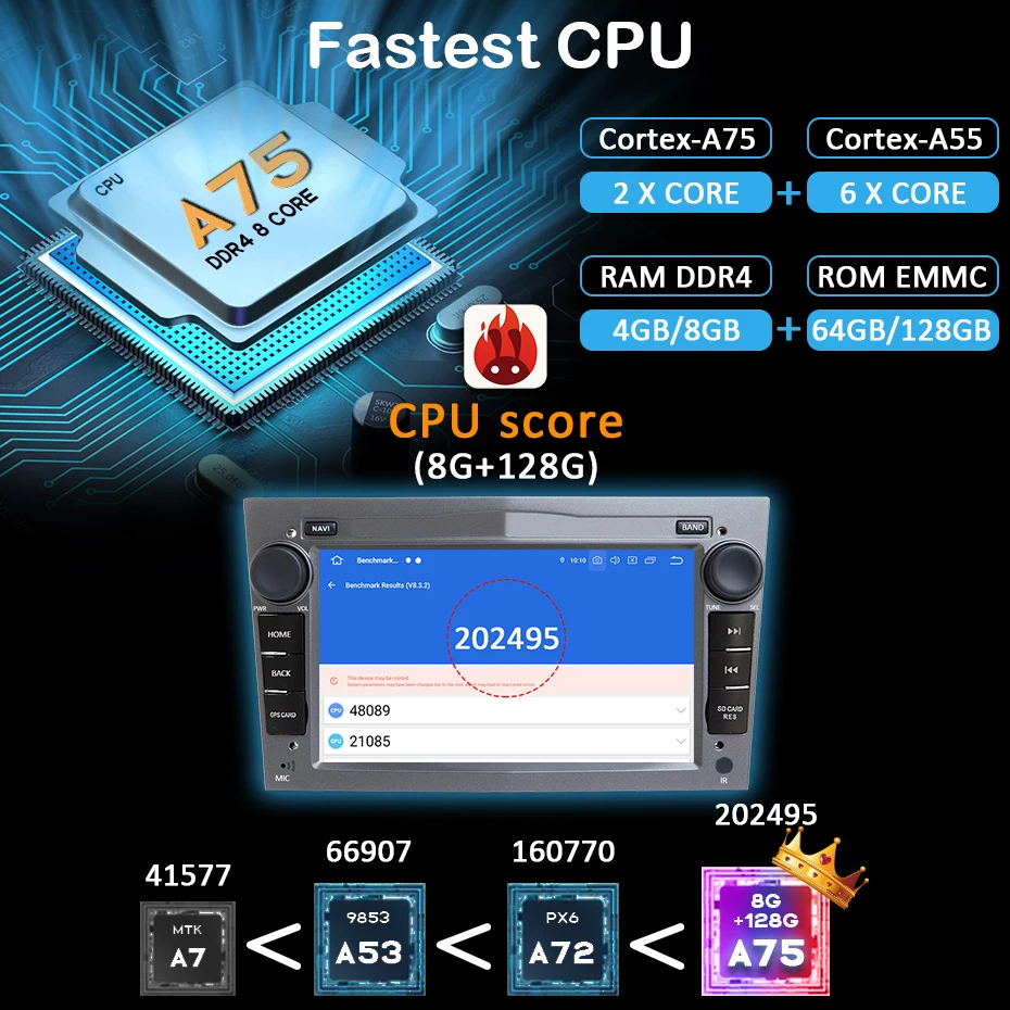 Самый быстрый процессорСамый быстрый процессор на современном рынке.Лучше, чем PX5 PX6 7862 9853 или другие ЦПAntutu Score- 202495, это самый высокий балл во всех ЦП в настоящее время
