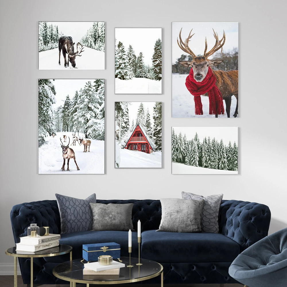 Рождественский стиль, искусство на стену, Зимняя Страна Чудес, Постер, холст, картина с принтом оленя, пейзаж, Скандинавская Настенная картина, декор для гостиной