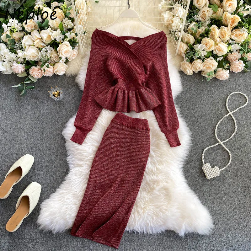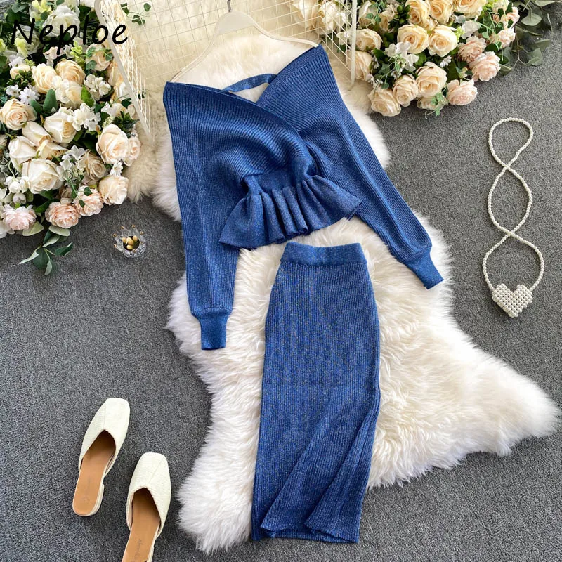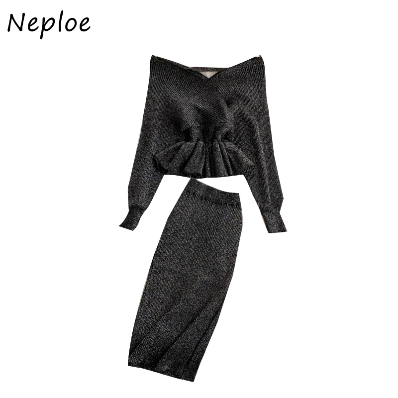 Женский офисный костюм Neploe в уличном стиле, Женский Топ с длинным рукавом и вырезом лодочкой + Однотонная юбка-карандаш, Женский трикотажный комплект из двух предметов