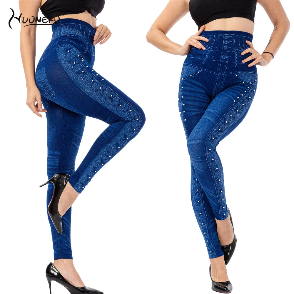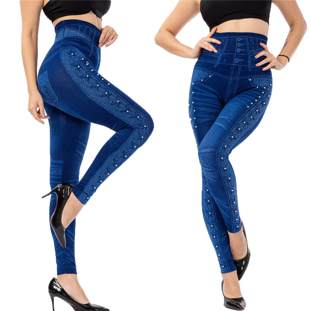Женские спортивные Леггинсы с высокой талией, имитация бисера, джинсовые облегающие эластичные бесшовные брюки-карандаш, джинсы, женские солнцезащитные леггинсы WLG05