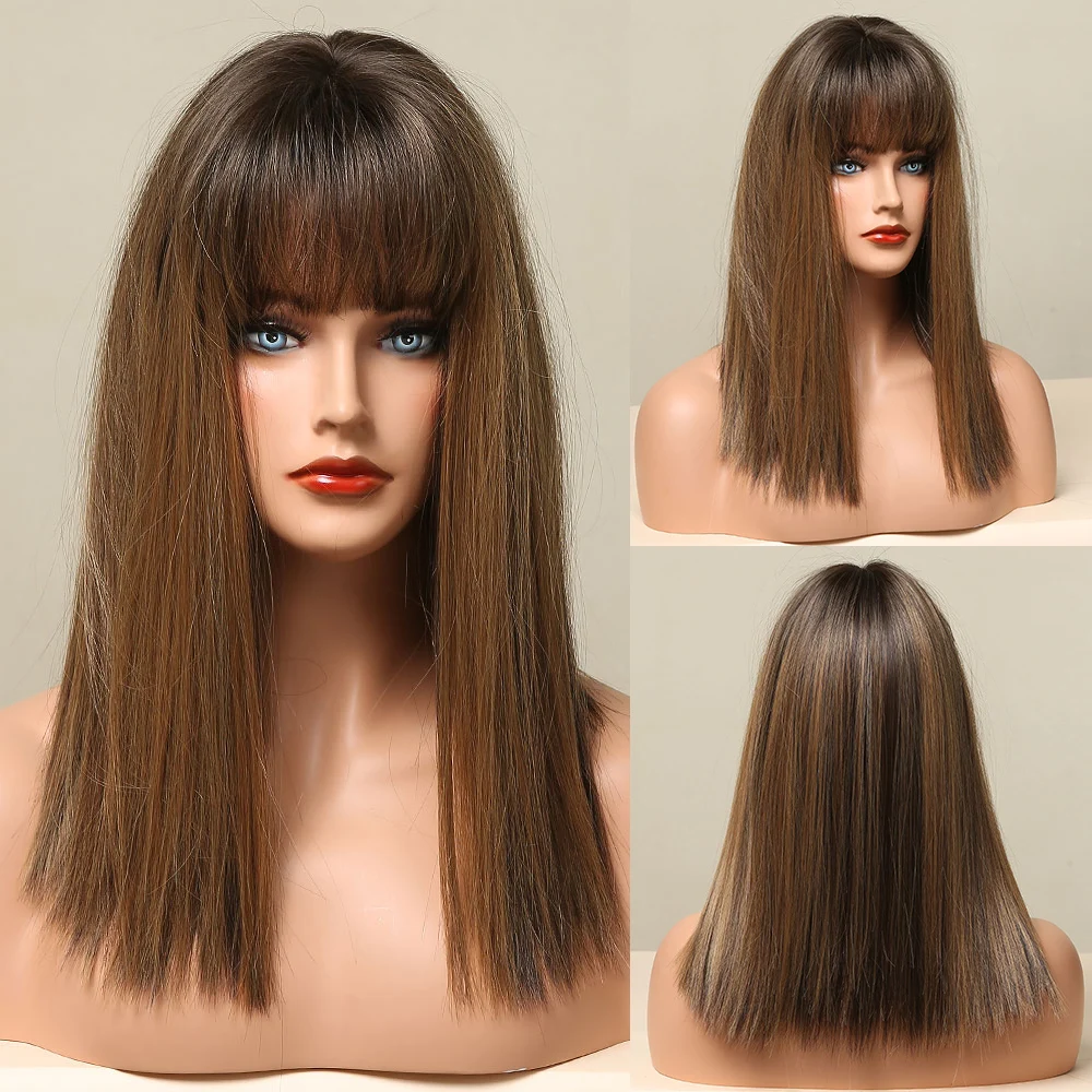Парики синтетические Средние прямые с боковой челкой, Омбре, цвет т...