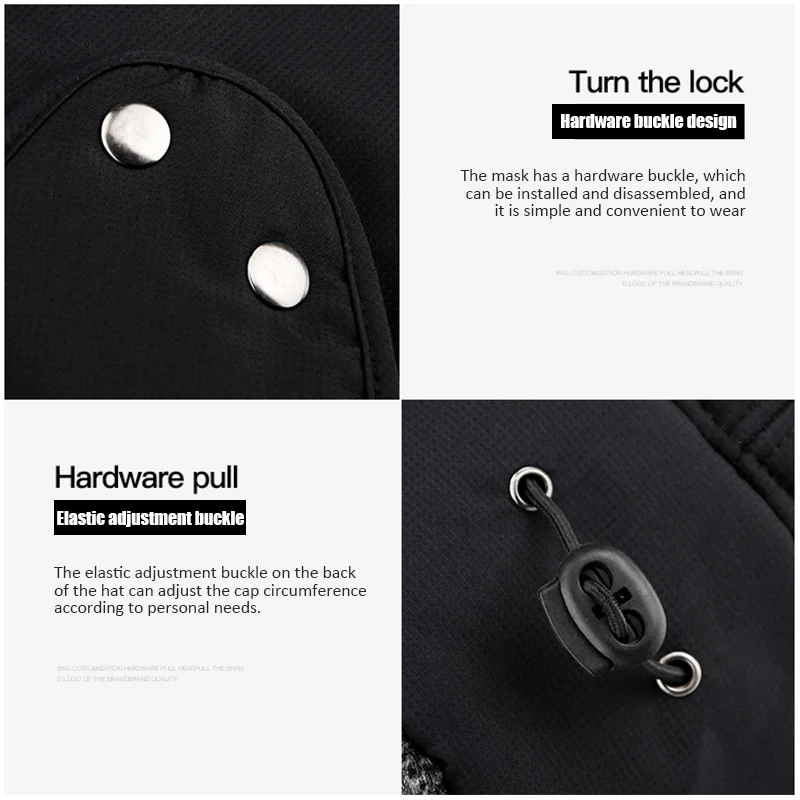 Поверните замокКонструкция металлической пряжкиМаска имеет металлическую пряжку, которую можно установить и разобрать, и ее легко и удобно носитьАппаратная тягаЭластичная Регулируемая пряжкаЭластичная Регулируемая пряжка на задней части шляпы может регулировать окружность шапки в соответствии с личными потребностями.