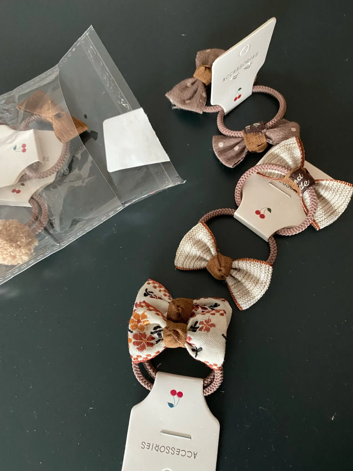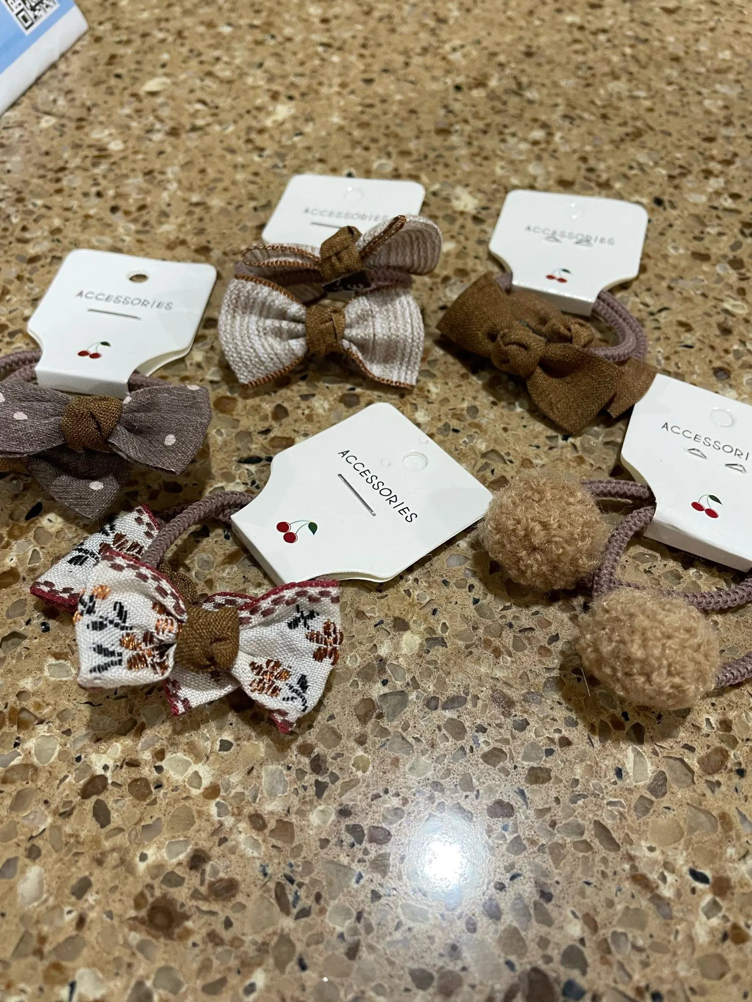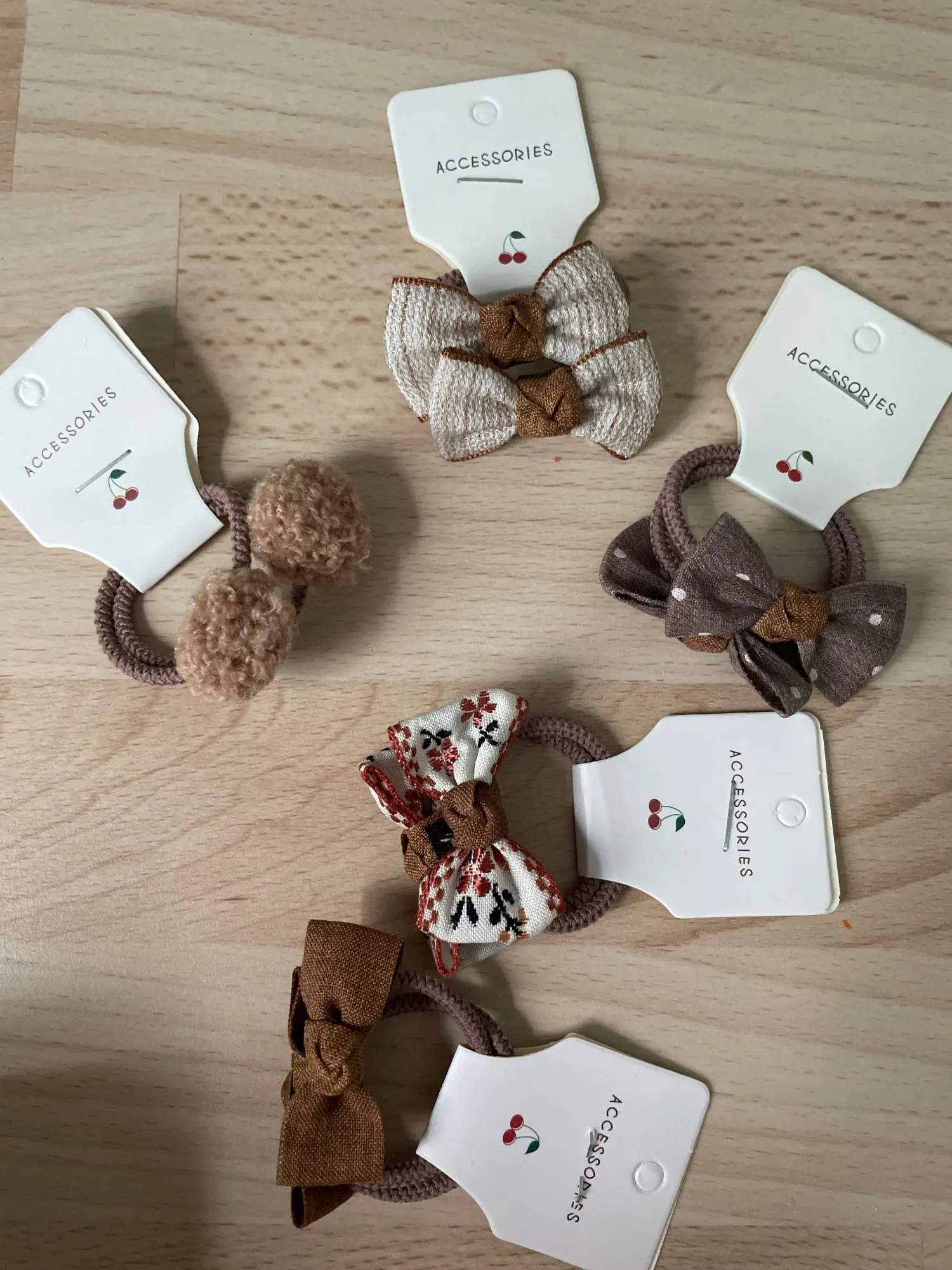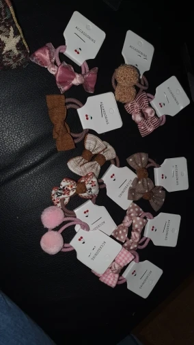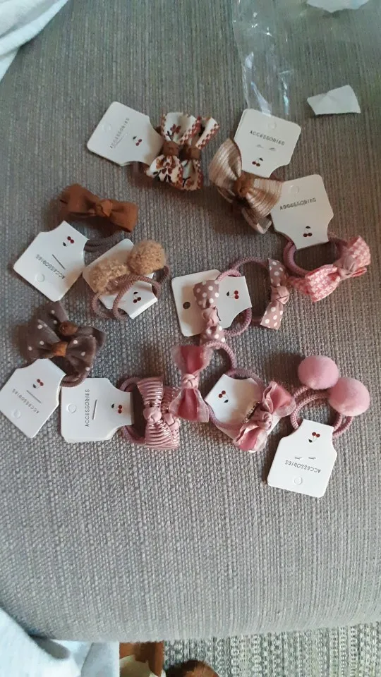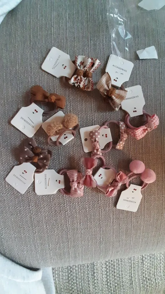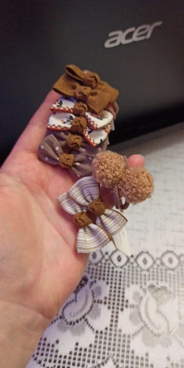 10 gomas preciosas , en tonos marrones, con lazos y pompones. la goma es elástica y sujeta muy bien el pelo, y el diseño es como en la foto, ideal para combinar con looks so cute! volvería a comprarlas sin duda, buscare más del mismo vendedor. recomendable 100%