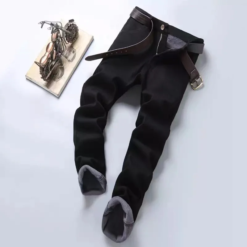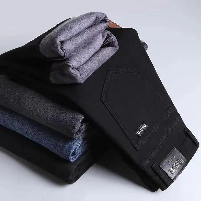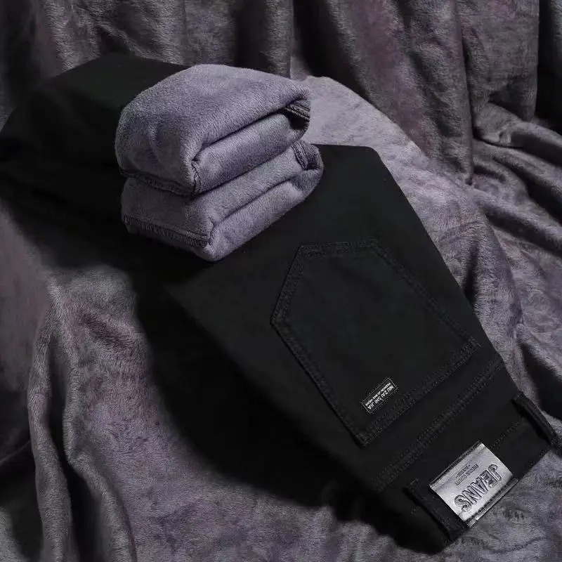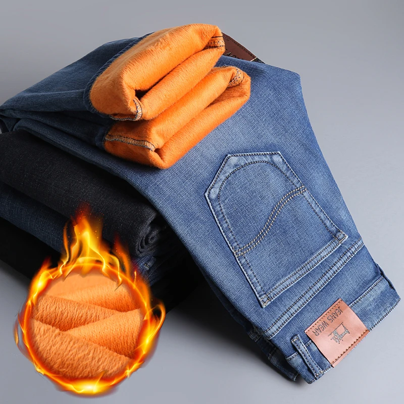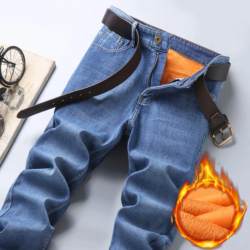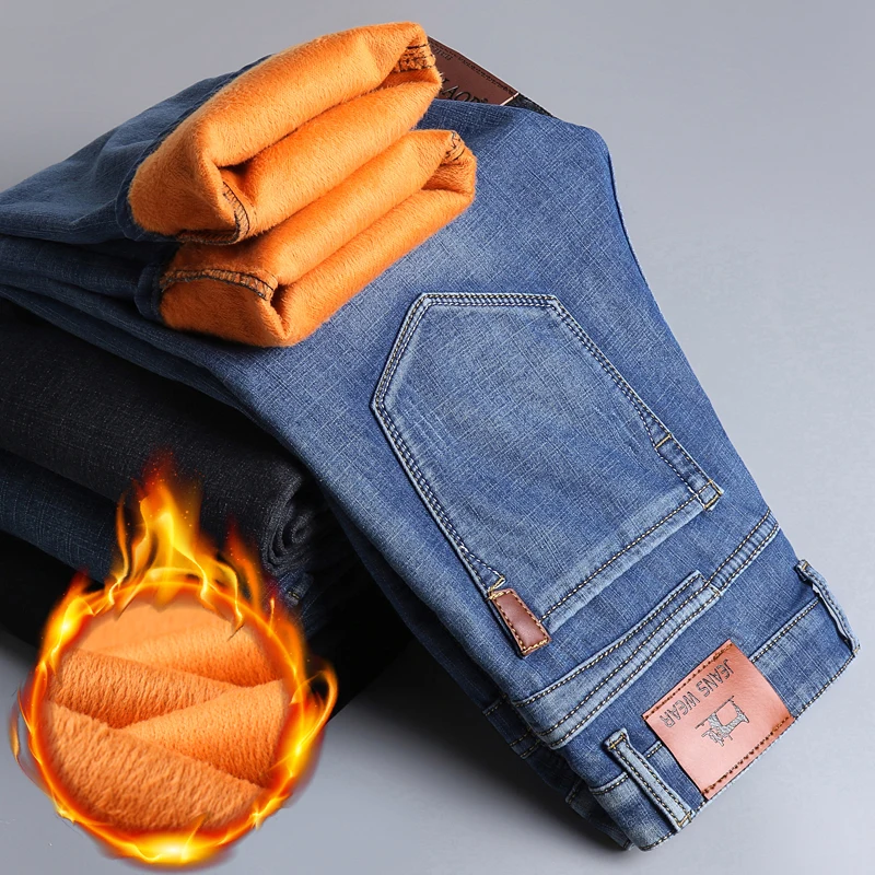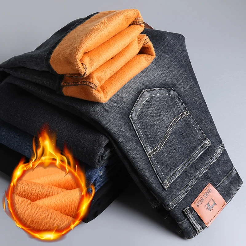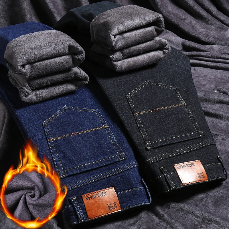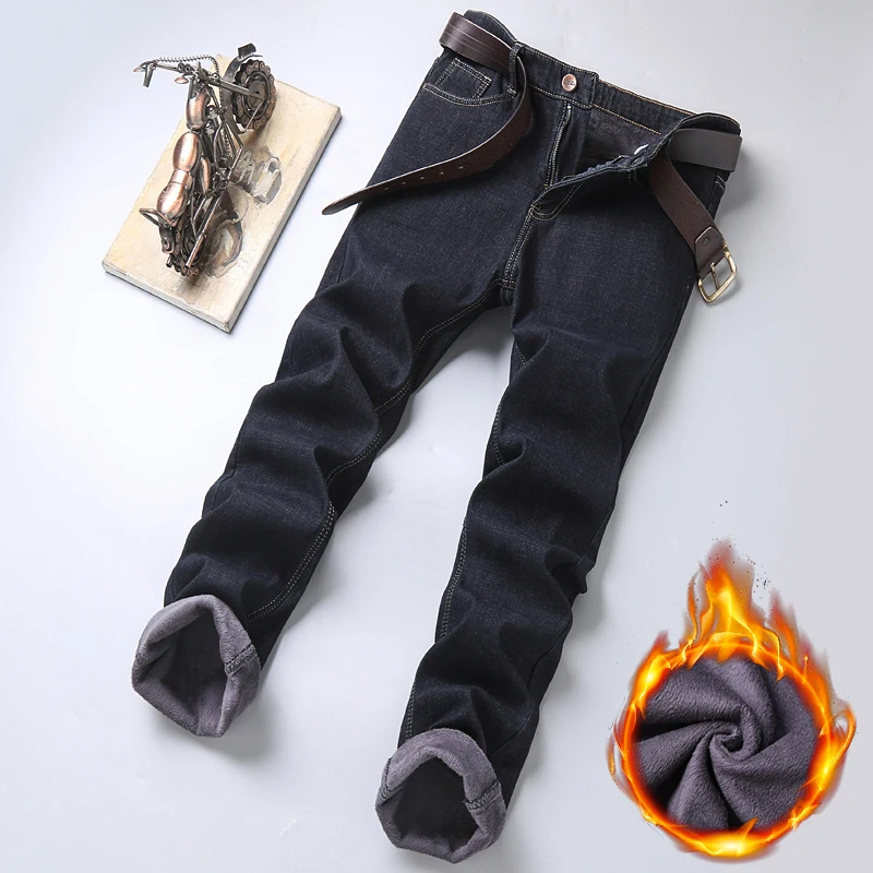 Мужские зимние джинсы, серыесиние облегающие эластичные плотные бархатные теплые джинсы, повседневные флисовые брюки, мужские прямые джинсовые брюки