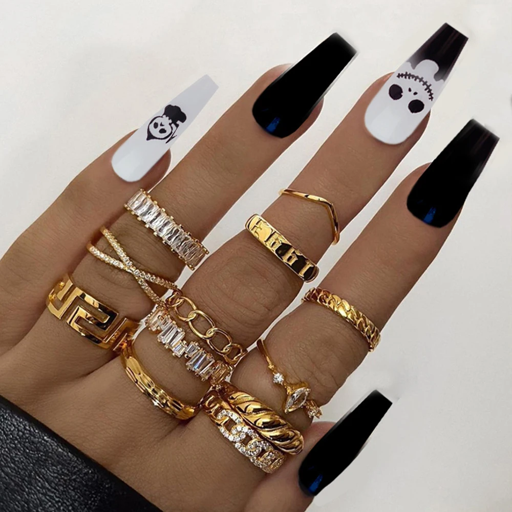 Накладные ногти в стиле Хэллоуин, 24 шт., черно-белый узор, длинный гроб, накладные ногти, полное покрытие, съемные накладные ногти