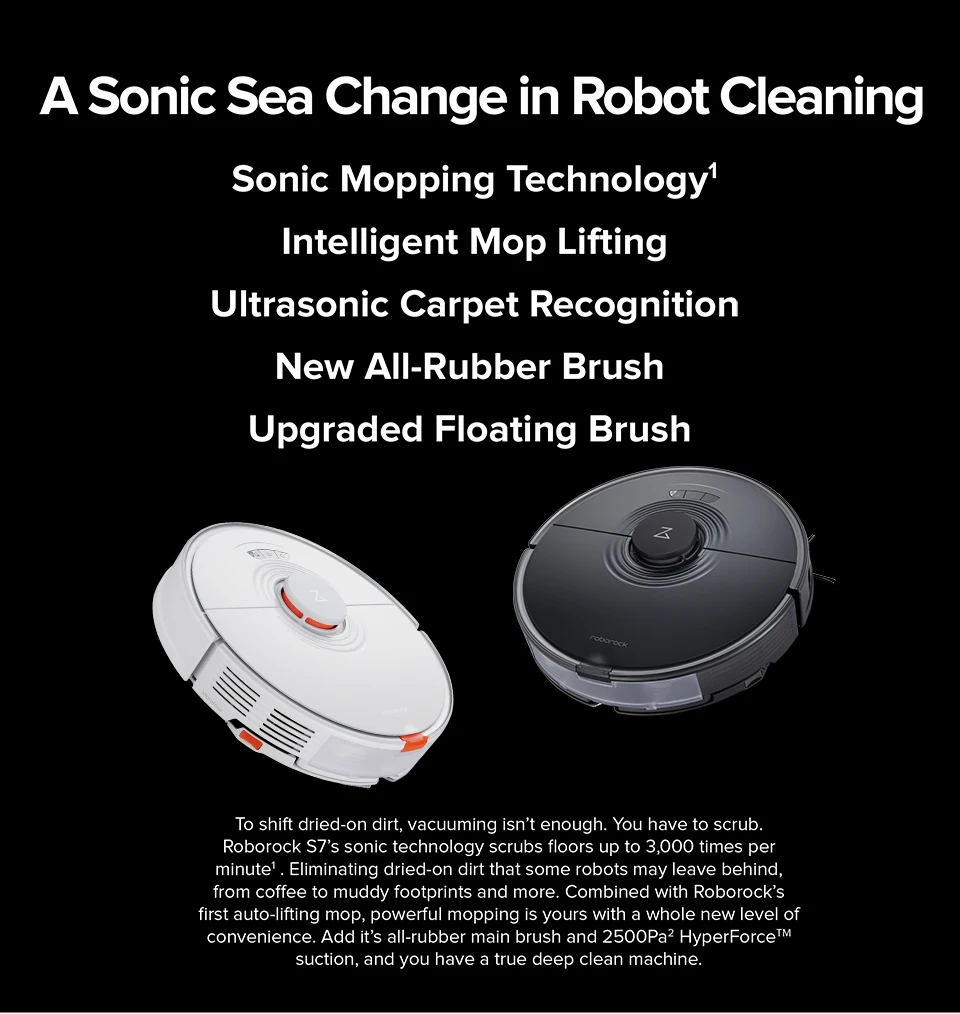 Для переноса сухого загрязнения пылесоса недостаточно. Вам нужно почистить. Звуковая технология Roborock S7's scrubs полы до 3000 раз в минуту *. Устранение сухого загрязнения, которое некоторые роботы могут оставить позади, от кофе до грязных следов и многого другого. В сочетании с первой автоподъемной шваброй Roborock, мощная мойка-ваш совершенно новый уровень удобства. Добавьте всю резиновую основную щетку и 2500Pa** Гиперсила™Всасывание, и у вас есть настоящая машина глубокой очистки.