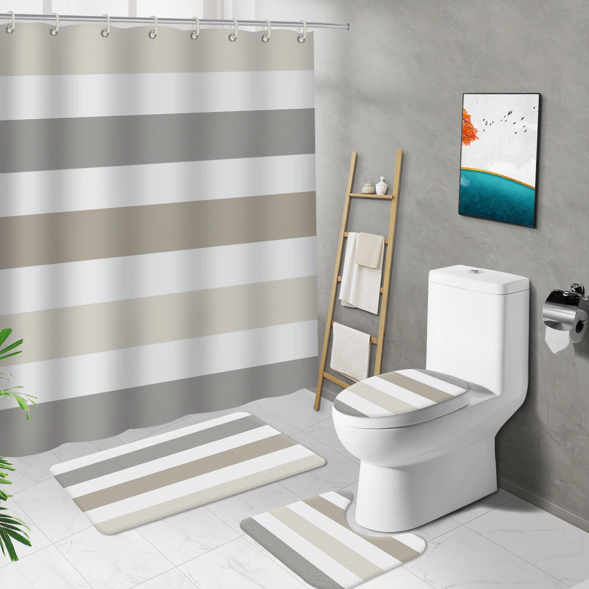 Длинная душевая занавеска в современную полоску серого цвета, аксес...