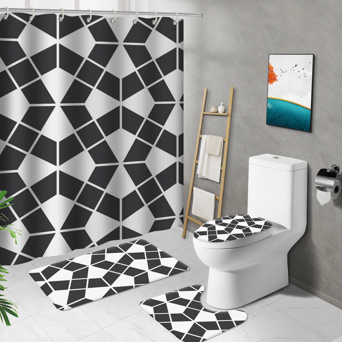 Простая длинная душевая занавеска с ромбовидным принтом, набор аксессуаров для ванной комнаты, набор ковриков, чехол для унитаза, нескользящий водонепроницаемый коврик для ванной с крючками