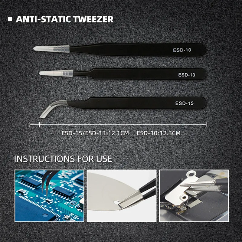 【Пинцет и оловянный скребок3 серии ESD пинцет, который может достигать различных узких мест для зажима небольших деталей. Распылительная краска на поверхности из нержавеющей стали Антистатическая, долговечная и практичная. 2 шт. жестяных скребков, которые могут быть использованы не только в качестве spudger, но и для соскабливания паяльной пасты.