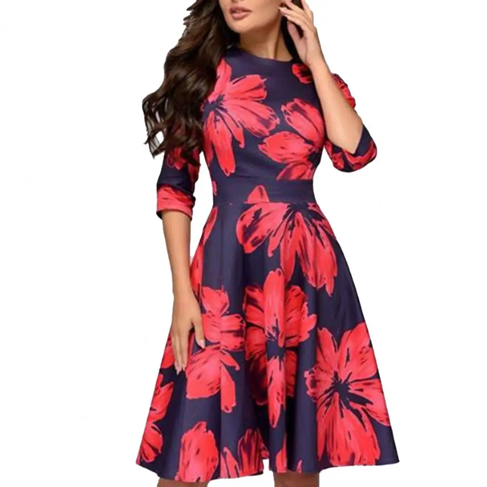 Женское облегающее платье с круглым вырезом, плиссированное платье средней длины с рукавами 34 и цветочным принтом и широким подолом, уличная одежда