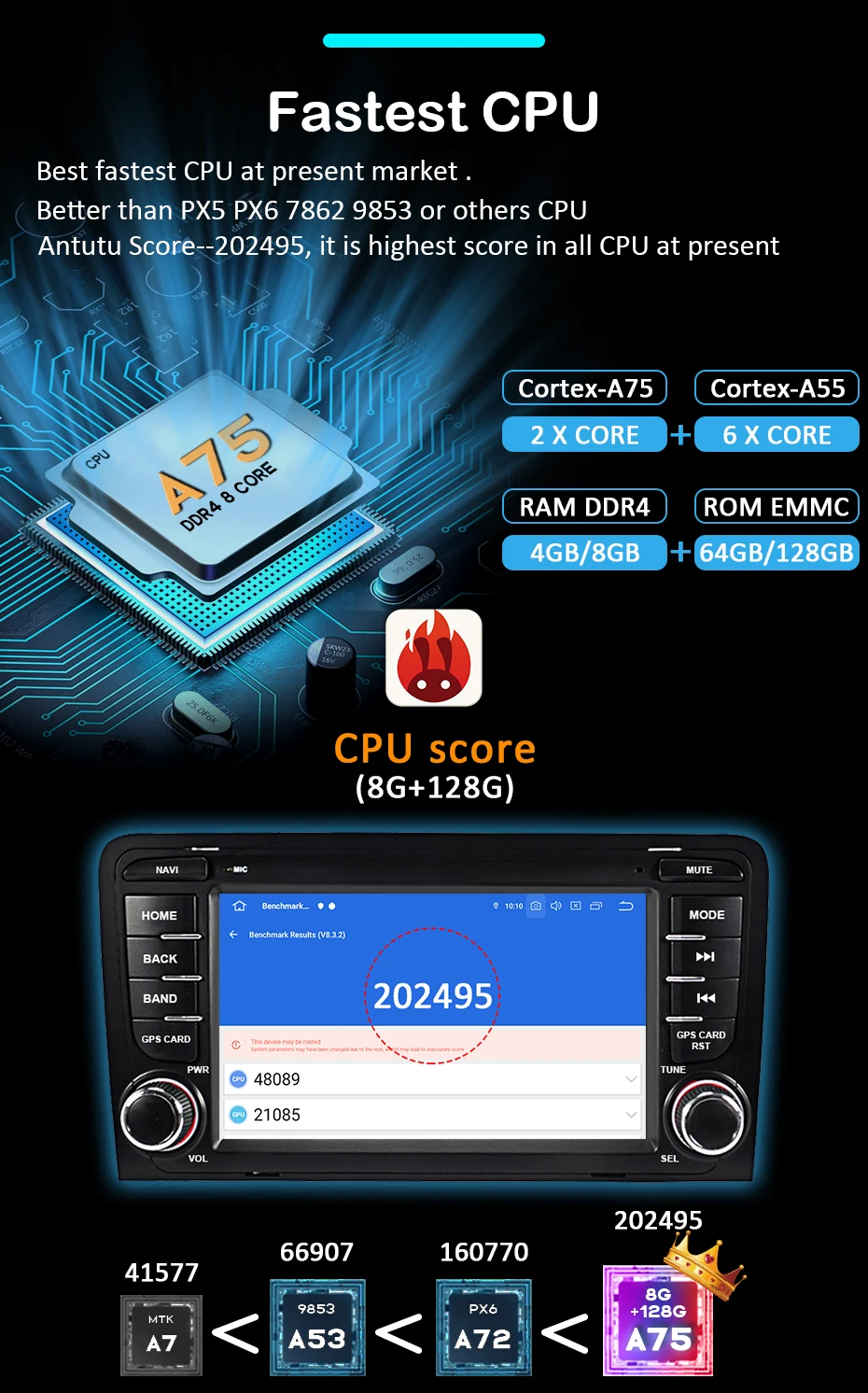 Самый быстрый процессорСамый быстрый процессор на современном рынке.Лучше, чем PX5 PX6 7862 9853 или другие ЦПAntutu Score- 202495, это самый высокий балл во всех ЦП в настоящее время