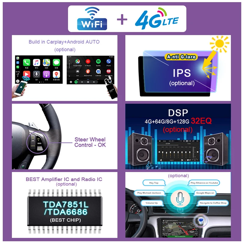 DSP (только 4G + 64G /8G + 128G имеет 32EQ)DSP = Система цифрового усилителя. Он делает звук лучше, чем раньше, и делает радиосигнал лучше, чем раньше. Только менее высокая версия автомобиля имеет заводскую систему DSP на рынке. Если вы покупаете этот чип. В будущем у вашего автомобиля будет DSP система.