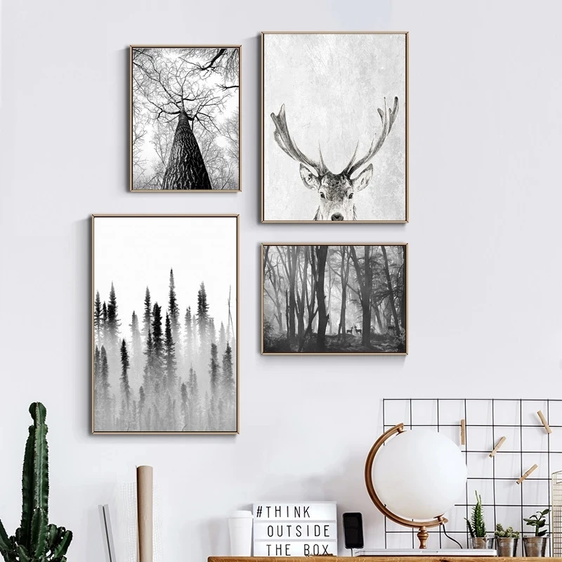 Черно-белый пейзаж, скандинавский постер, Лесной олень, Орлан, искусство на стену в скандинавском стиле, декор для гостиной