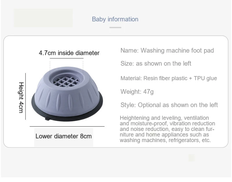 Изделие представляет собой нескользящую подкладку для ног стиральной машины, которая может эффективно уменьшить шок и тишину и продлить срок службы стиральной машины в определенной степени. Продукт разработан, чтобы быть красивым и практичным. Стиральная машина и коврик для ног соединены как одно тело. После регулировки уровня, стирка и обезвоживание стабильны и не трясутся. В дополнение к использованию на стиральной машине, его также можно использовать в других местах, таких как поднятие сиденья и подушечки для ног, чтобы легко очистить мусор, И предотвращает повреждение нижней части мебели и предотвращает воздействие влаги. Черная ПУ нескользящая резиновая накладка, предпочтительно специальный ТПУ материал, гибкий и износостойкий, не скользит, чтобы защитить землю от царапин.