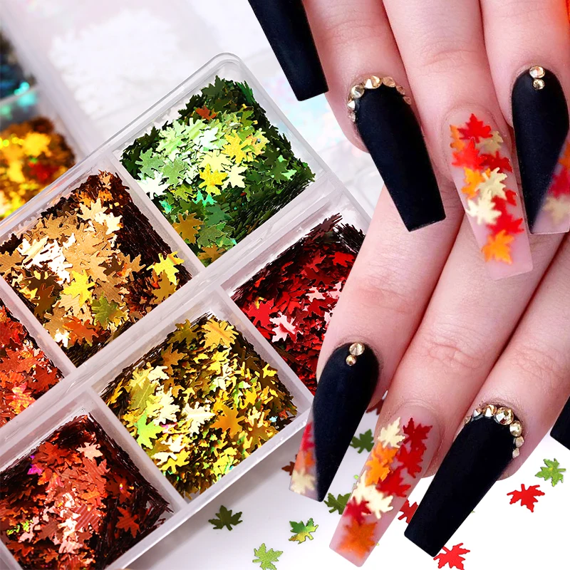 6 ячеек кленовые листья дизайн ногтей блестки кленовый лист пайетка Снежинка осенний Маникюр 3D украшение для ногтей