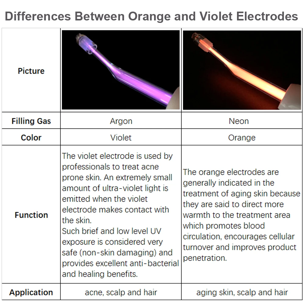 Высокочастотный уход за кожей лица используется профессионалами для лечения и предотвращения упрямых прыщей, сокращения увеличенных пор, уменьшения появления тонких линий и морщин, избавления от самых пышных глаз, выцветают круги темных глаз, омолаживают состояние кожи головы и питают волосяные фолликулы для более здорового роста волос.Основные различия между оранжевыми и фиолетовыми высокочастотными электродамиВысококачественные высокочастотные электроды, как правило, изготовлены из закаленного стекла и заполнены либо1) аргоновый газ, который производит тонкое фиолетовое цветное свечение, или2) неоновый газ, который производит оранжевое свечение. Высокочастотный электрод выступает в качестве безопасного проводника тока. Высокая частота-это чудесное комплексное лечение, предлагающее множествоПреимущества для многих проблем по уходу за кожей, начиная от акне до морщин.Электрод цвет Газа функцияОранжевый неоновый для лечения старения кожи, кожи головы и волосФиолетовый аргон для лечения акне, кожи головы и волосОбычно фиолетовый электрод используется профессионалами для лечения кожи, подверженной акне. Чрезвычайно малое количество ультрафиолетовый светильник излучается, когда фиолетовый электрод контактирует с кожей.Такое короткое и низкое УФ-воздействие считается очень безопасным (не повреждает кожу) и обеспечивает отличные антибактериальные и лечебные преимущества.Оранжевые электроды, как правило, указываются при обработке стареющей кожи, потому что, как говорят, они направляют больше тепла в область лечения, которая способствует циркуляции крови, стимулирует клеточный оборот и улучшает проникновение продукта.