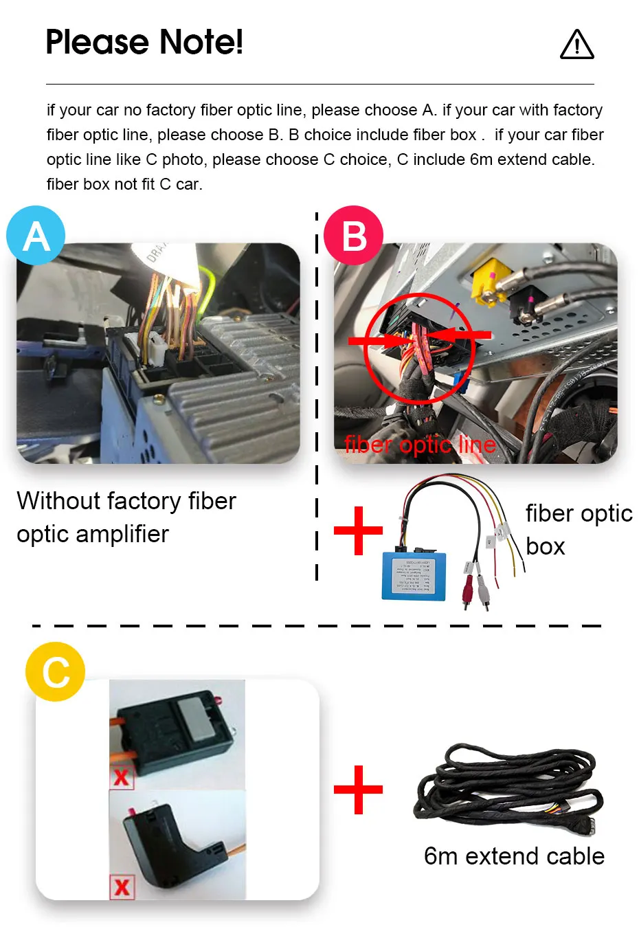 Если у вашего автомобиля нет заводской оптоволоконной линии, пожалуйста, выберите A.Если ваш автомобиль с фабричной оптоволоконной линией, пожалуйста, выберите B. B выбор включает коробку из волокна.Если ваша Автомобильная волоконно-оптическая линия, такая как C фото, пожалуйста, выберите C выбор, C Включает 6m Удлиненный кабель. Коробка из волокна не подходит для автомобиля C.