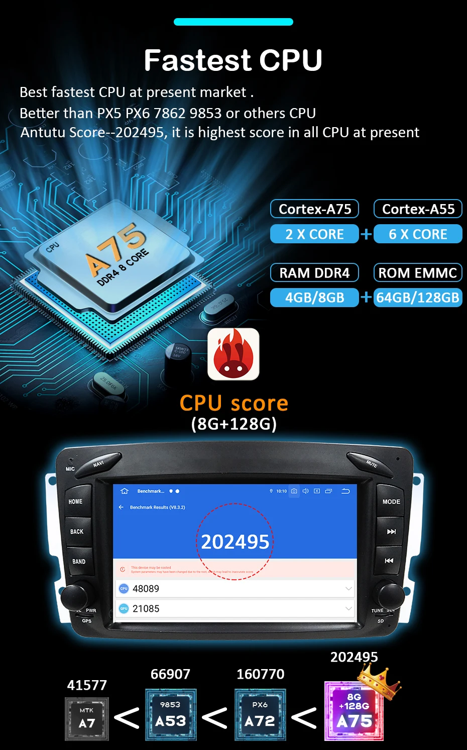 Самый быстрый процессорСамый быстрый процессор на современном рынке.Лучше, чем PX5 PX6 7862 9853 или другие ЦПAntutu Score- 202495, это самый высокий балл во всех ЦП в настоящее время