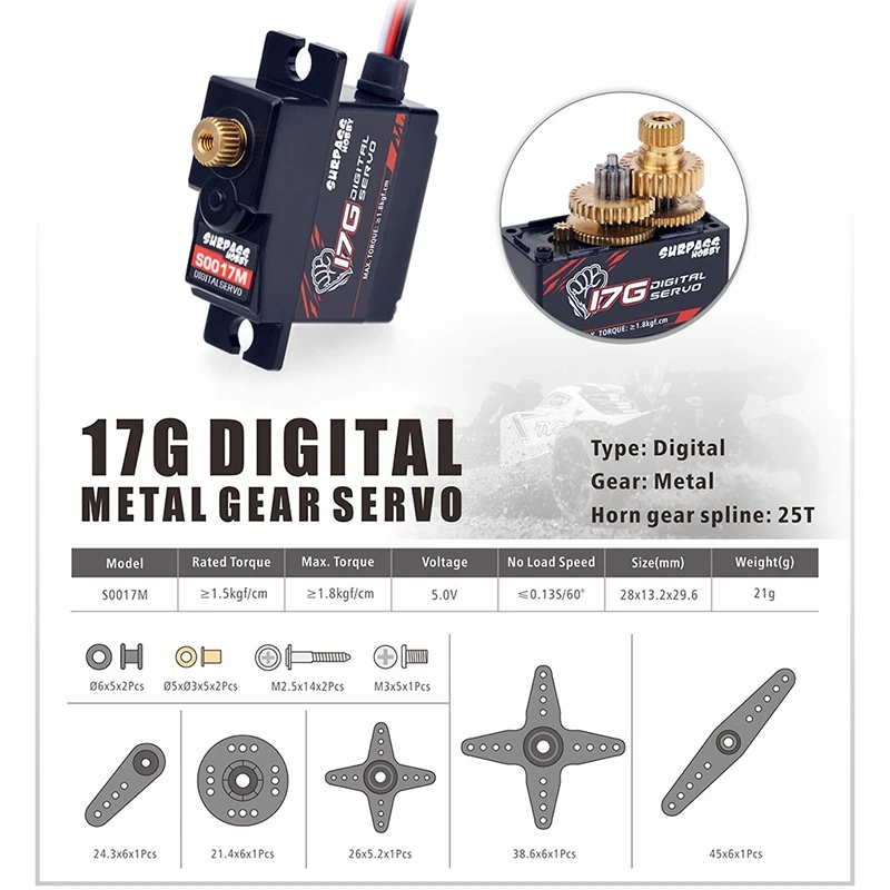 Цифровой сервопривод SURPASS HOBBY S0017M, 17 г, металлическая Шестерня 1,8 кг, для радиоуправляемых самолетов, роботов 118, грузовиков, автомобилей, лодок, воздуховодов