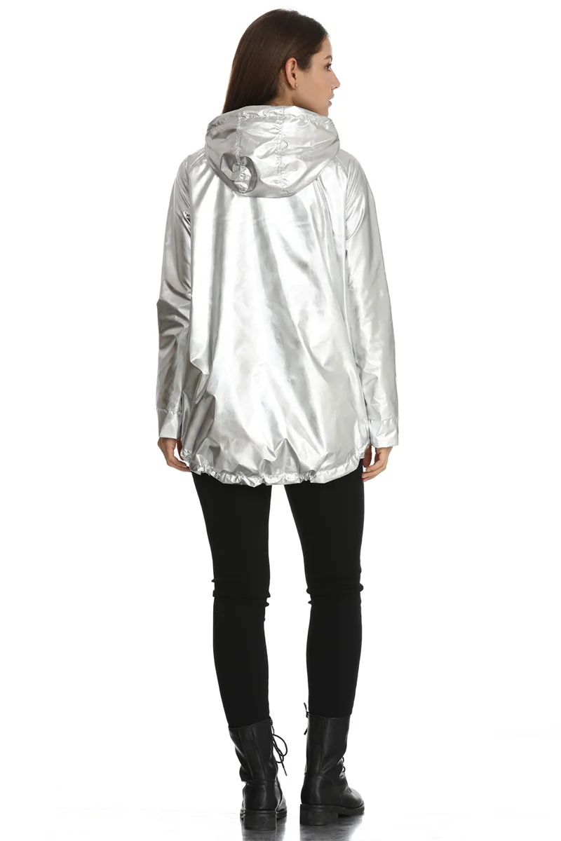 Женская Блестящая ветровка с капюшоном, куртка на молнии, золотистая, серебристая ветровка, спортивная куртка с капюшоном