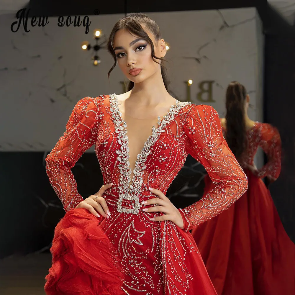 Красное вышитое бисером вечернее платье русалки с глубоким v-образным вырезом в Дубае с юбкой мусульманское женское вечернее платье для свадьбы, выпускного бала
