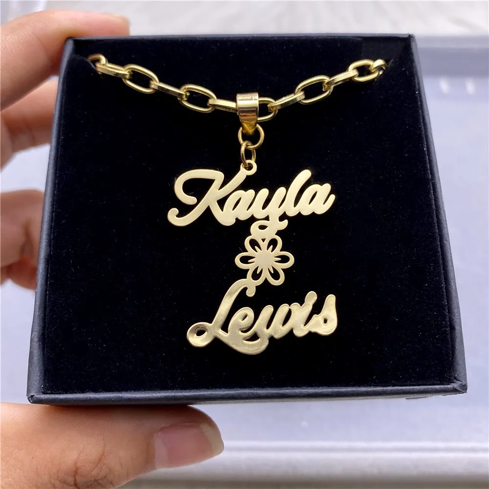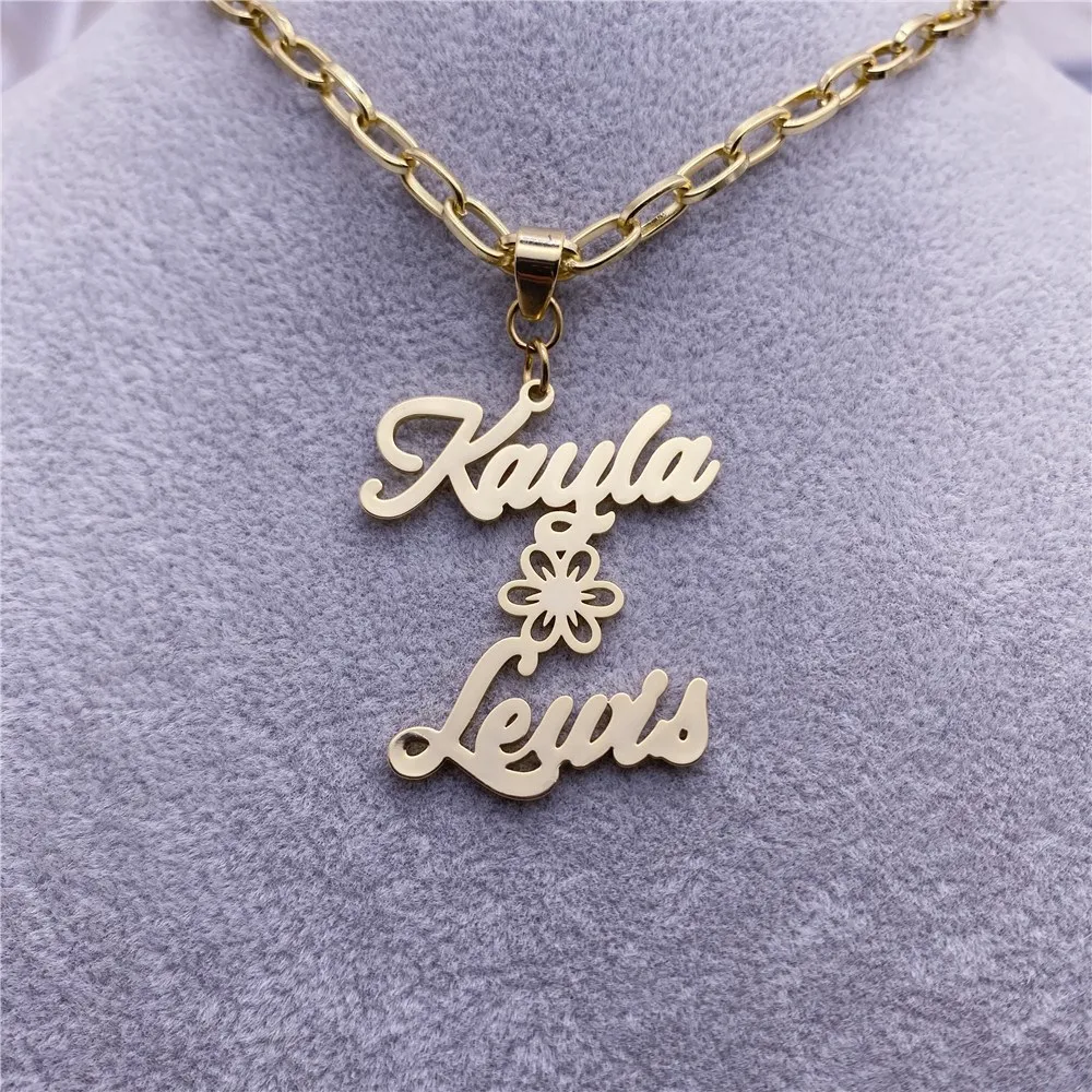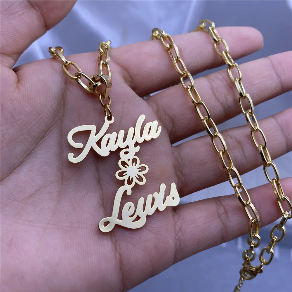 Ожерелье с именем на заказ с двумя именами, ожерелье с зажимом для бумаги с цветком, ювелирные изделия из нержавеющей стали на заказ, рождественский подарок