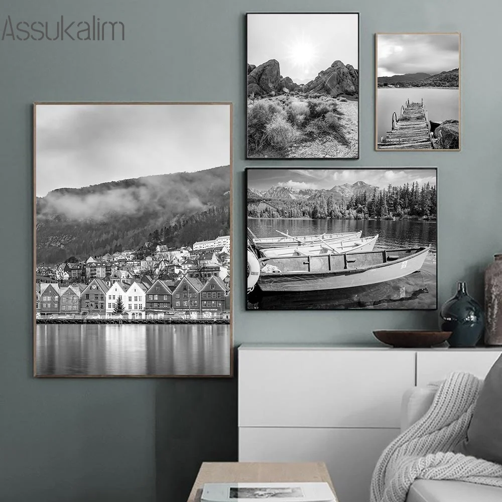 Черно-белый постер, пейзаж, живопись, озеро, лодка, плакаты, принт ...