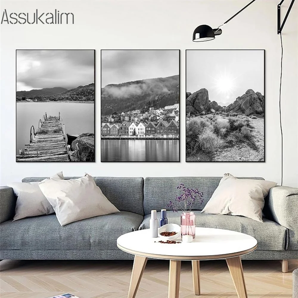 Черно-белый постер, пейзаж, холст, живопись, гор, озеро, настенные ...