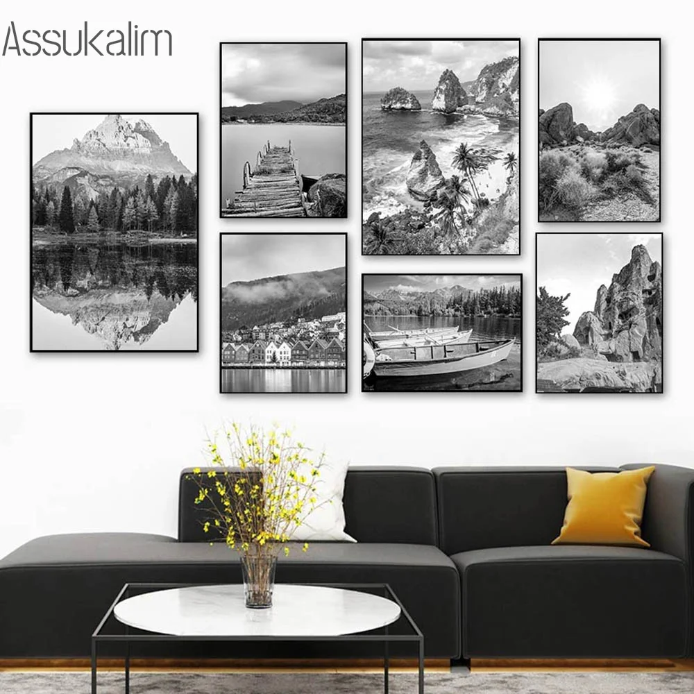 Черно-белый постер, пейзаж гор, озеро, отражение, холст, живопись, ...