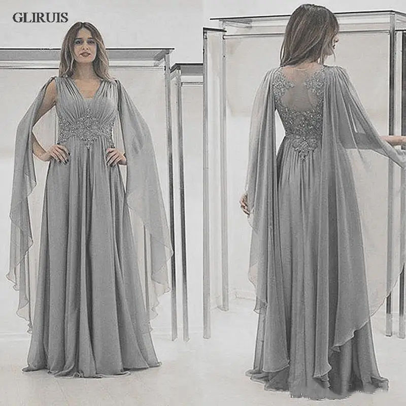 Длинное платье для матери невесты с накидкой, серебристо-серое шифоновое кружево с аппликацией, строгое искусственное платье для гостей свадебной вечеринки