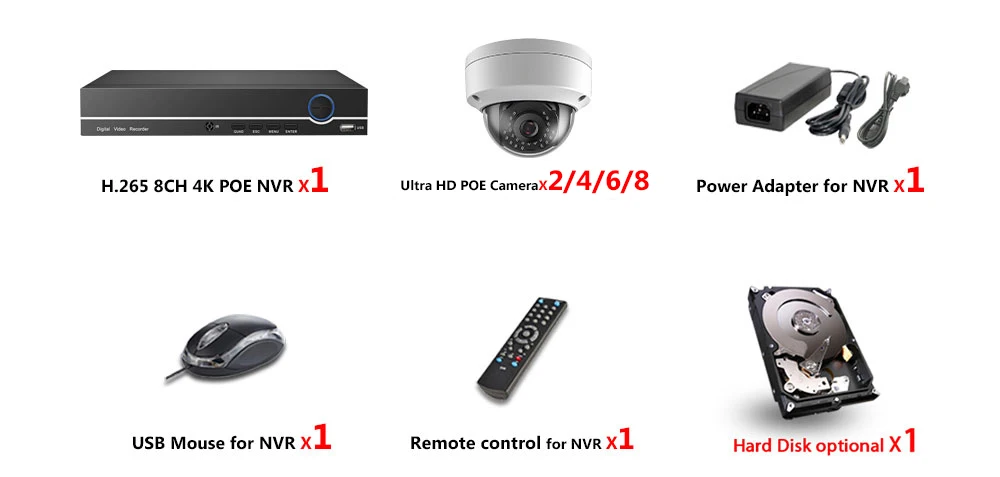 1 сетевой видеорегистратор 8CH 4K POE NVR;2/4/6/8 X HD POE IP 5.0MP для дома и улицы ИК Ночного Видения Всепогодные камеры;1 X Блок питания для NVR;1 х USB мышь для NVR;1 компакт-диск программного обеспечения для NVR;1 пульт дистанционного управления для NVR;Жесткий диск опционально!