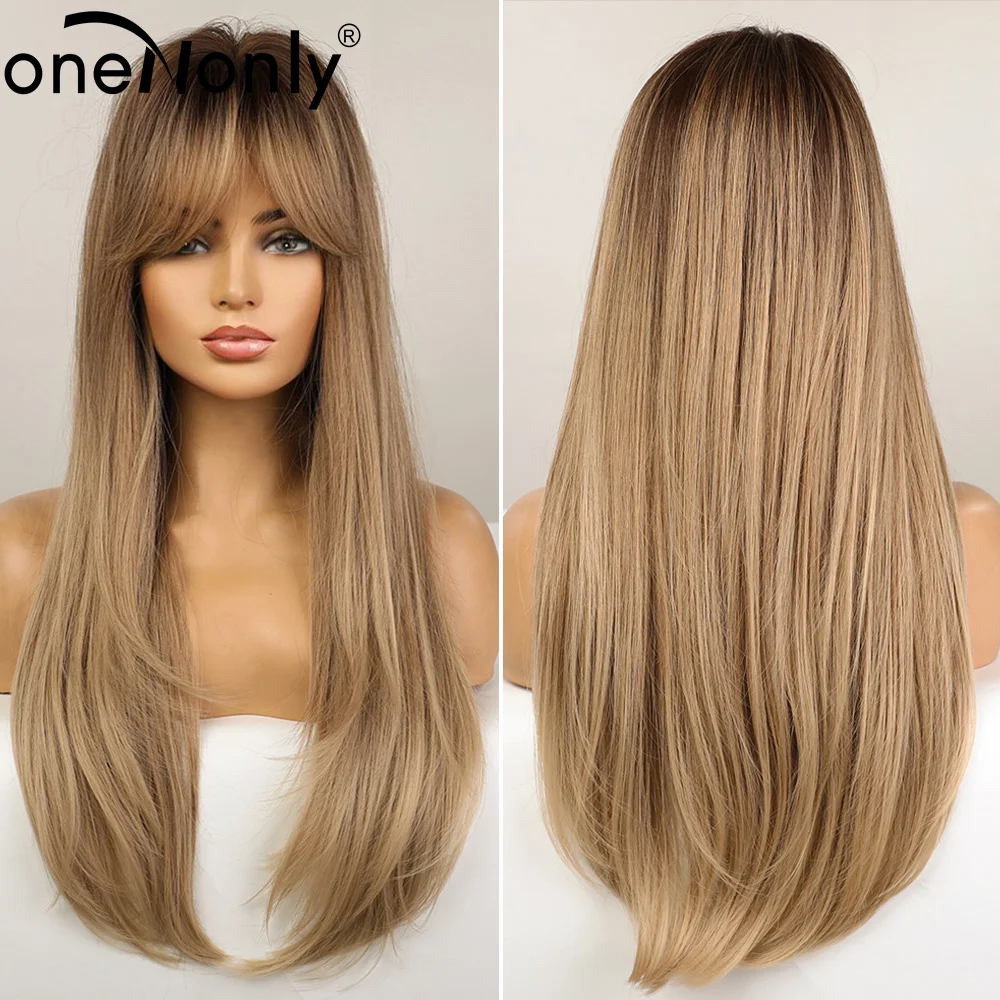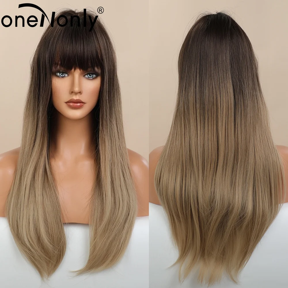 OneNonly длинный прямой темно-коричневый парик блонд омбре с челкой для черных женщин синтетические парики Косплей ежедневные волосы термостойкие
