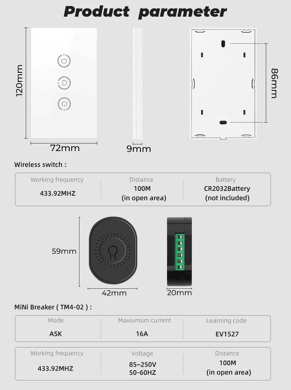 1. Рабочая частота: 433,92 МГц2. Метод модуляции: ASK3. Размер: 120*72*9 (мм)4. Аккумулятор Cr2032 2 шт. (без аккумулятора)Параметры контроллера:Напряжение: 85 ~ 250 В, 50-60 ГцТок: 16АРабочая частота: 433,92 МГцМатериал: Поликарбонат огнестойкий V0Размер: 59x42x20ммКод исследования: EV 1527Расстояние приема: 100 м открытое расстояние