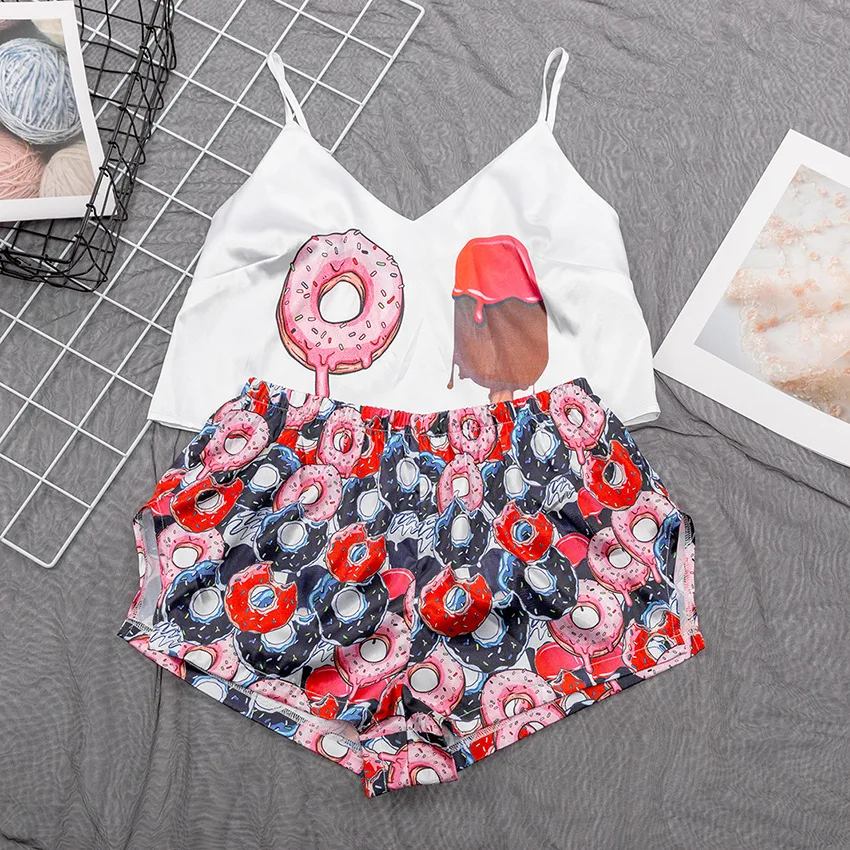 Пижама женская, шелковая, на бретельках, с принтом в виде фруктов