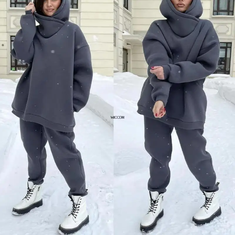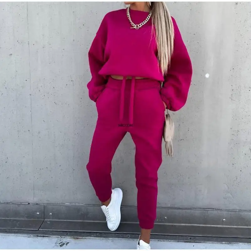Женские теплые толстовки, Женские однотонные комплекты для свитшота и длинных брюк, модные костюмы из двух предметов, женский элегантный свитшот, Осень-зима
